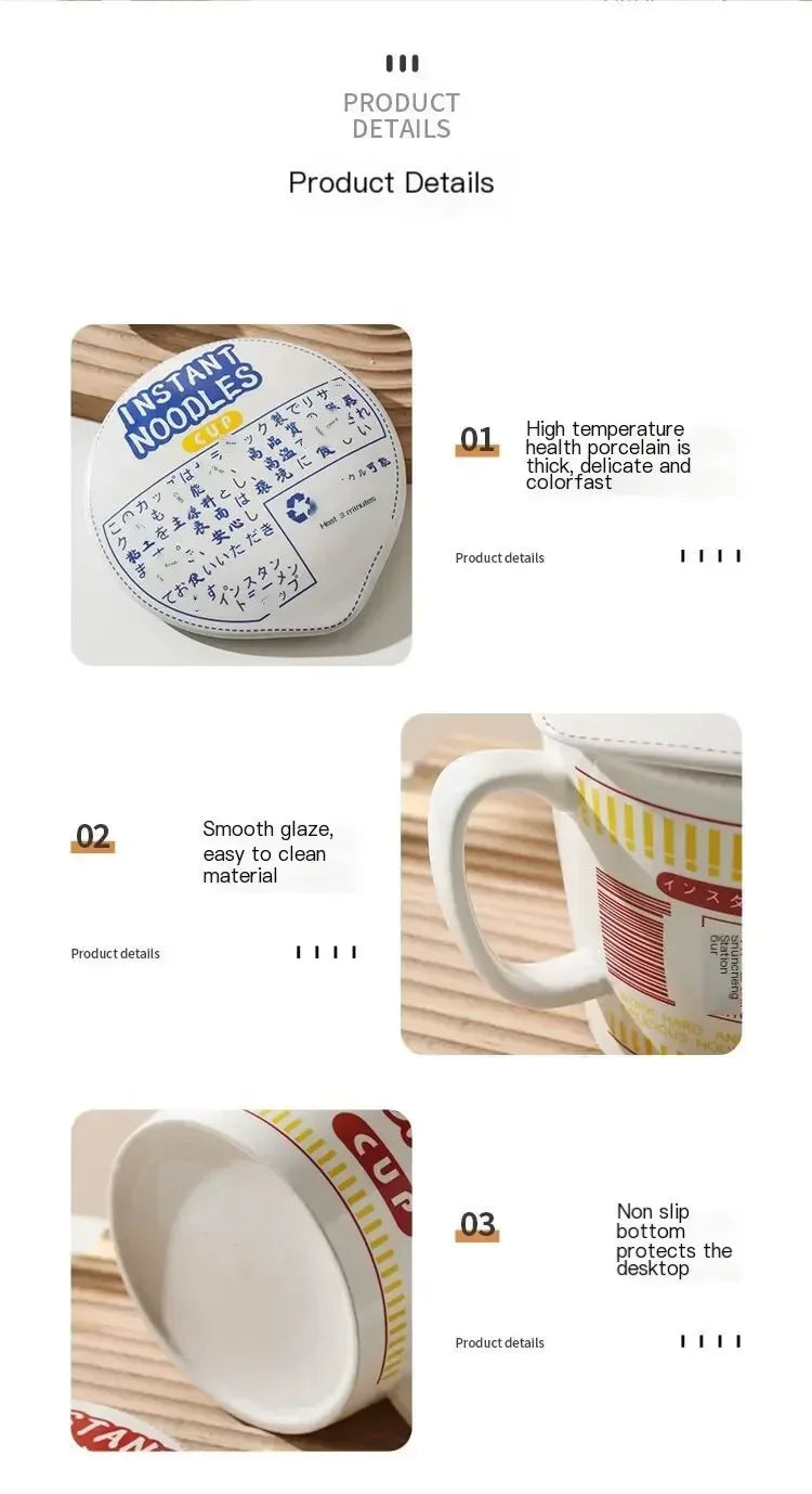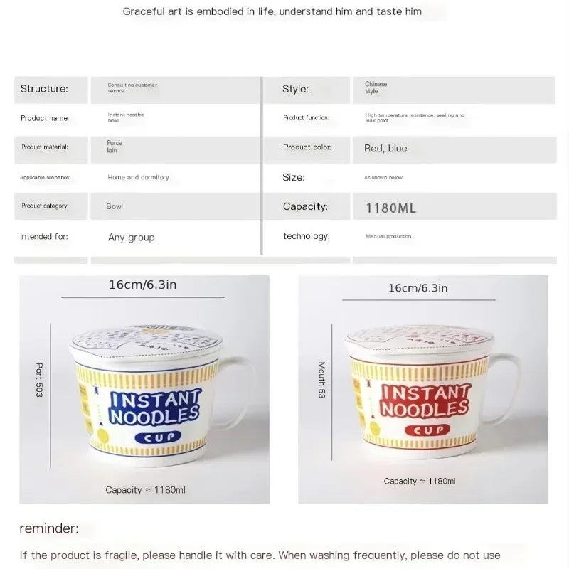 - Hvid keramik med gule stribede accenter og rødt "Instant Noodles Cup" motiv