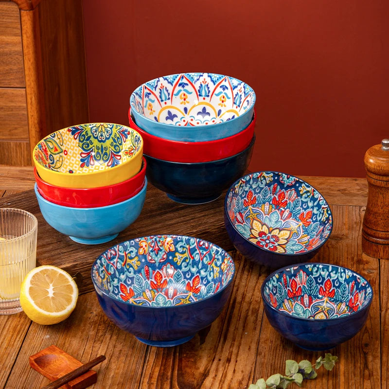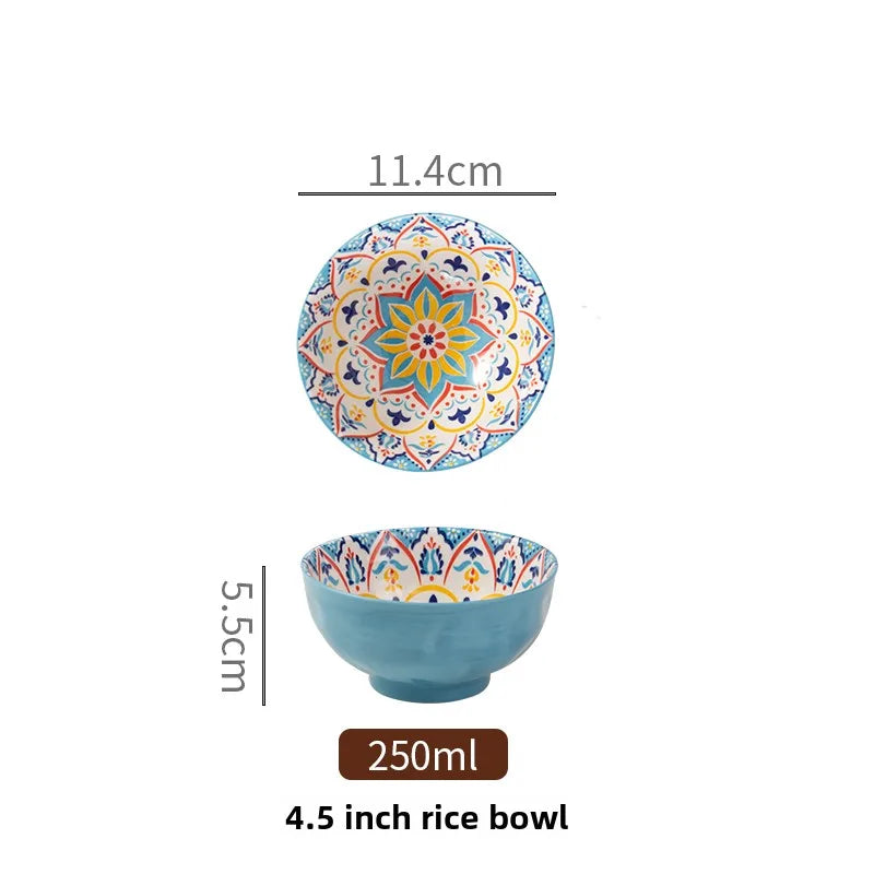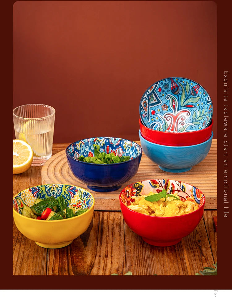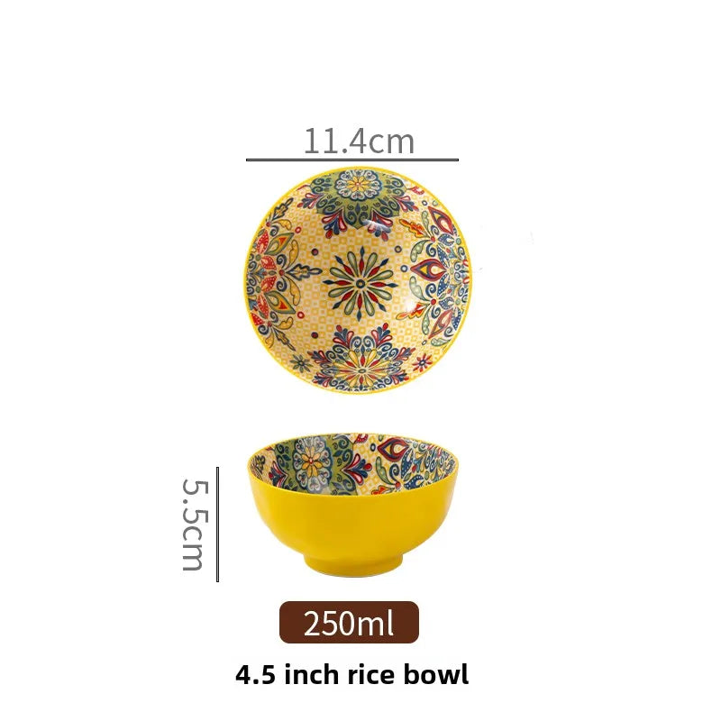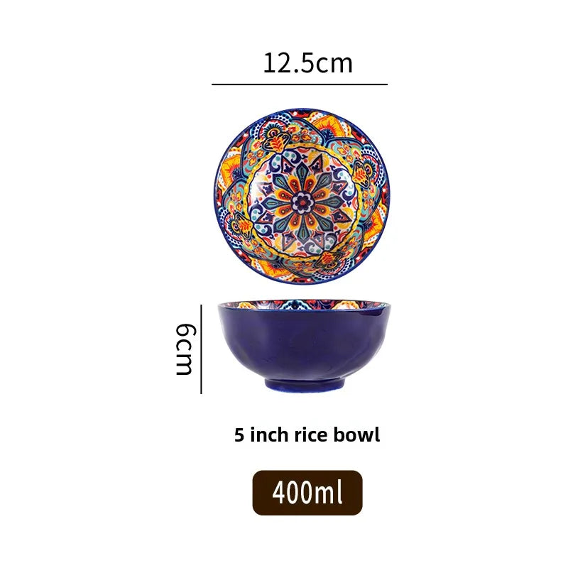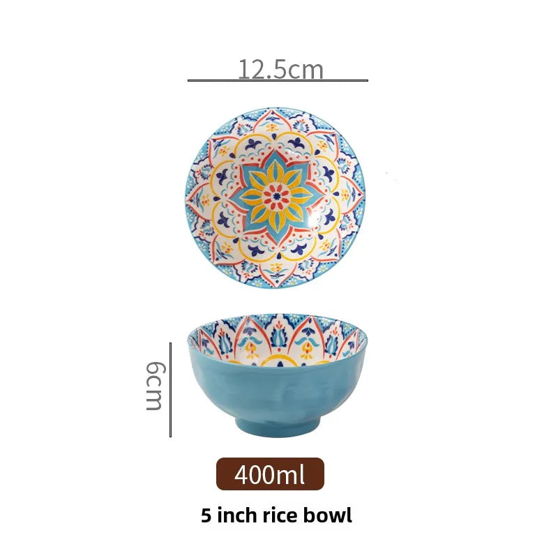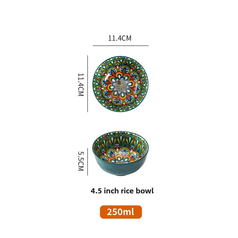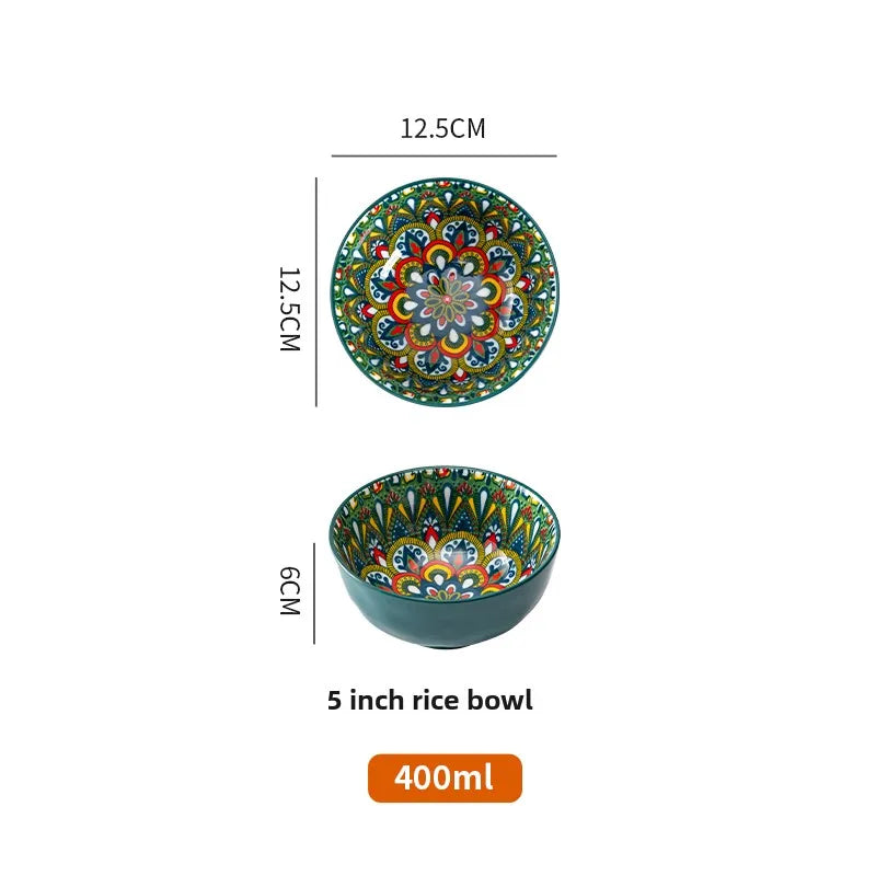 Løft dine daglige måltider med Bohemian Rice Bowl, en keramisk skål designet til ris, nudler og små portioner. Dens retro-inspirerede, boheme-mønstre bringer levende farver til bordet, samtidig med at den bevarer en praktisk, robust form til daglig brug.