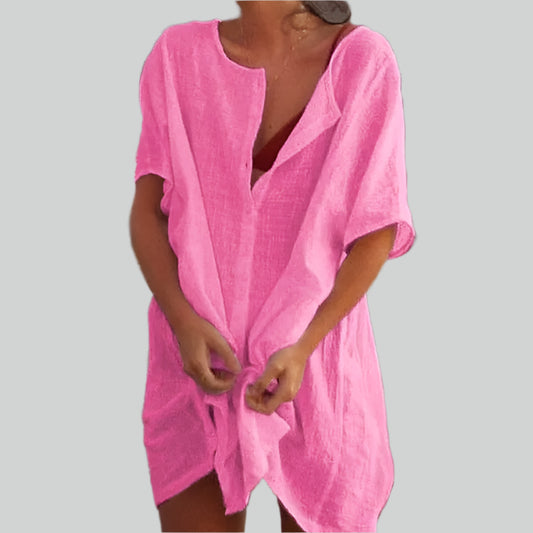 Baumwoll-Leinen Lange Bluse Sommer Kurzarm Vintage Übergröße Lässiges Shirt