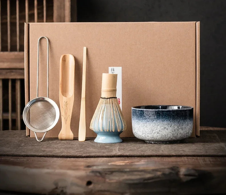 6-teiliges japanisches Matcha-Tee-Werkzeugset enthält essentielle Bambus- und Keramikwerkzeuge für traditionelle DIY-Teezeremonien. Dieses handgefertigte Set umfasst ein Metall-Teesieb, einen Bambus-Chashaku-Löffel, eine schlanke Teespachtel, einen Bambus-Chasen-Schneebesen, eine Bambus-Teebürste und eine glasierte Keramik-Teeschale, um Matcha mit authentischer Technik zu messen, zu schlagen, zu sieben und zu servieren.
