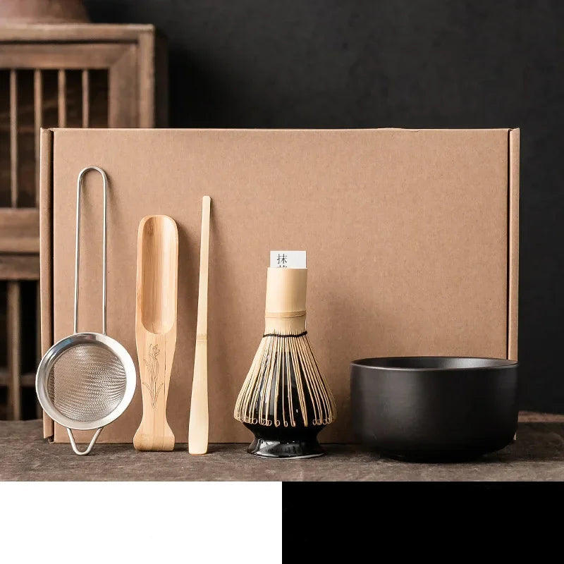 - Sechsteiliges Set: Metall-Teesieb, Bambus-Chashaku-Löffel, schlanke Teespachtel, Bambus-Chasen-Schneebesen, Bambus-Teebürste und glasierte Keramik-Teeschale.