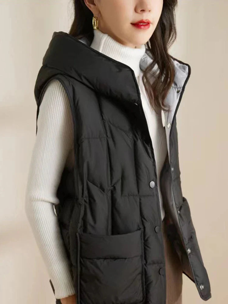 This sleeveless down vest combines a quilted, mid-length silhouette with a roomy hood and single-breasted snap closure to create a streamlined, modern look perfect for autumn and winter layering. The lightweight polyester shell and lofty white duck down filling deliver warmth without bulk, while the square quilting and utility pockets add a contemporary streetwear edge. Ideal for city commutes and weekend outings, this waistcoat reads both polished and practical—effortlessly taking you from daytime errands to relaxed evening plans.