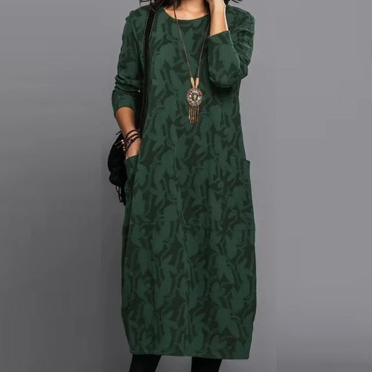 Long Sleeve Pocket Dress with Print - Elegant Vintage Style, Comfortable Fit for Women
