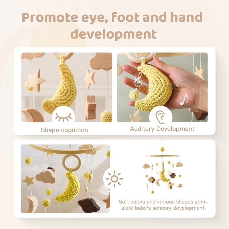 Enhance your baby's sleep and playtime with this charming wooden crib mobile, featuring a hot air balloon design that gently sways to create a soothing environment. This toy combines musical sounds, soft felt elements, and subtle flashing lights to provide auditory and visual stimulation, making it an ideal gift for newborns. Its durable construction and versatile features help promote comfort and early development for infants up to 36 months.