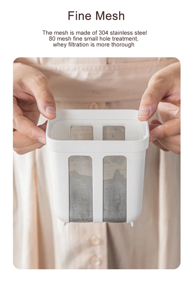 Yogurt Strainer Stainless Steel Filter For Whey Separation is a compact, purpose-built strainer designed to separate whey from yogurt and other dairy at home. The clear collection container with removable lid and vertical stainless-steel mesh panels lets whey drain cleanly into the base for easy monitoring and disposal.