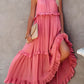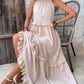Descubre la combinación perfecta de elegancia y comodidad con nuestro Vestido Maxi con Volantes y Cuello Halter. Ideal para diversas ocasiones, este vestido presenta un diseño elegante que realza tu silueta mientras garantiza libertad de movimiento.