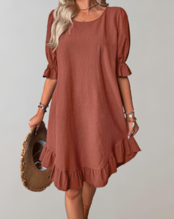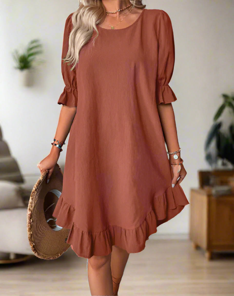 Este elegante vestido presenta mangas tres cuartos y volantes refinados, ofreciendo un ajuste chic y cómodo para cualquier ocasión. Su diseño versátil lo hace adecuado tanto para salidas casuales como para eventos especiales, permitiendo infinitas posibilidades de estilo.Características principales
