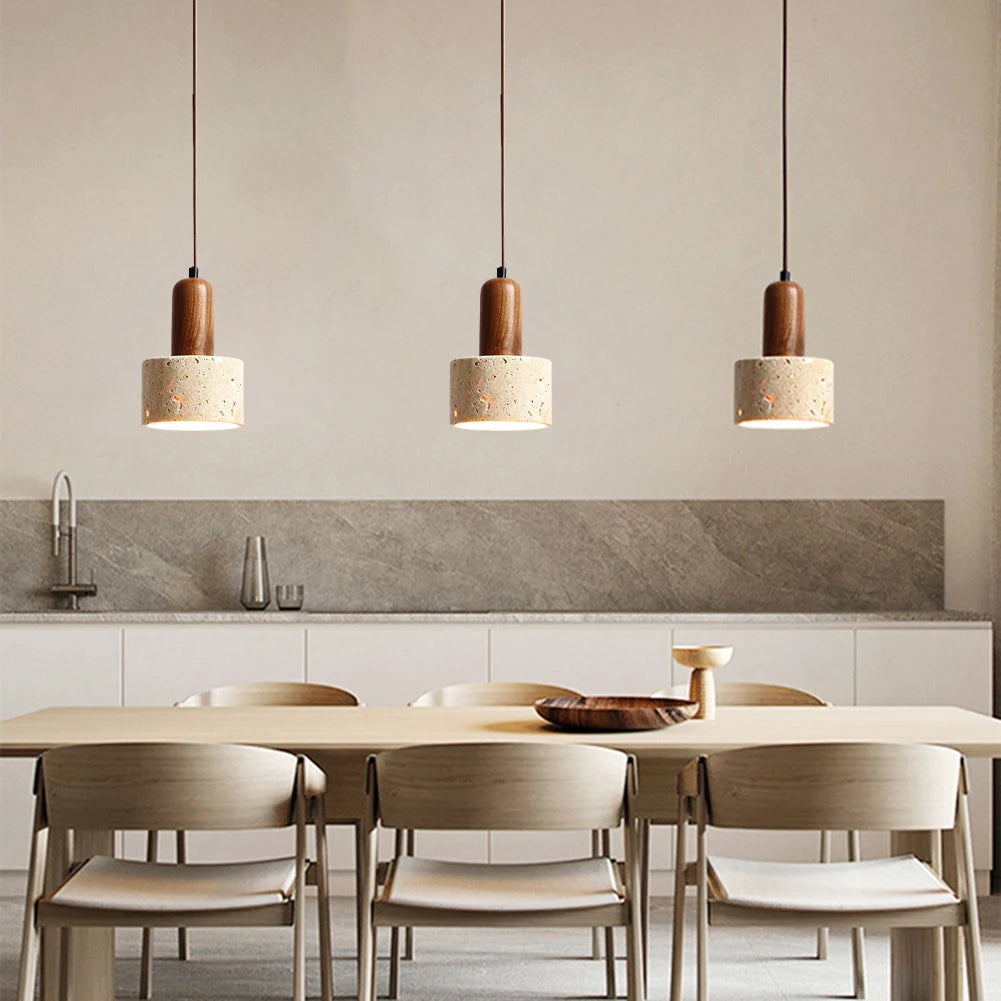 La lámpara colgante japonesa ofrece un punto focal limpio y moderno para salas de estar o dormitorios. Esta lámpara colgante decorativa combina un cálido cuerpo de madera con una pantalla de travertino beige para ofrecer un resplandor suave y enfocado desde arriba. Su diseño simple y autónomo facilita la instalación sobre una mesita de noche o área de asiento.