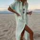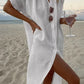 Vestido de verano de lino blanco con cuello vuelto y ajuste relajado para mujer