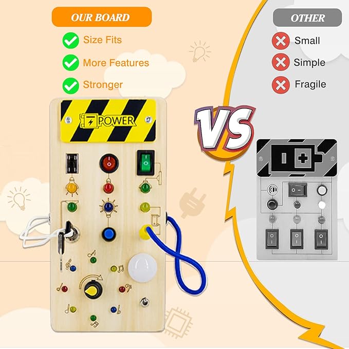 Mejore la experiencia de aprendizaje de su hijo con nuestros juguetes de entrenamiento sensorial de madera para niños. Esta tabla de actividades Montessori cuenta con atractivas luces LED y controles de interruptor, diseñados para estimular el aprendizaje temprano y el desarrollo sensorial. Perfecto como regalo atento para bebés y niños pequeños, es un complemento divertido y educativo para el tiempo de juego.