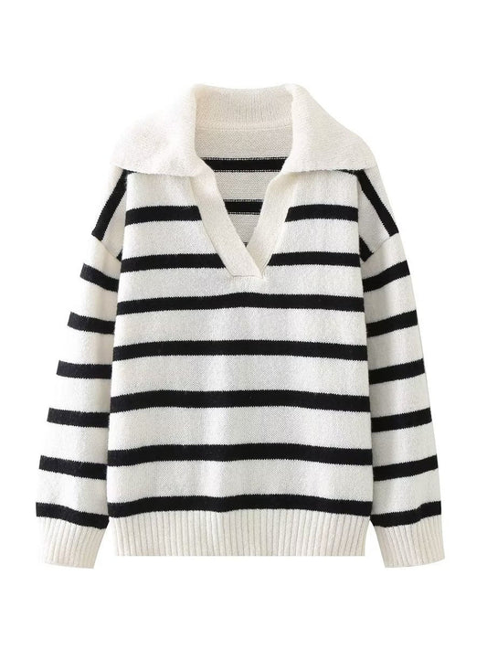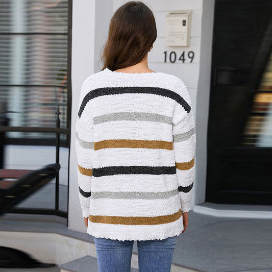 Warm Relaxed Women’s Striped Knitted Sweater - V Neck