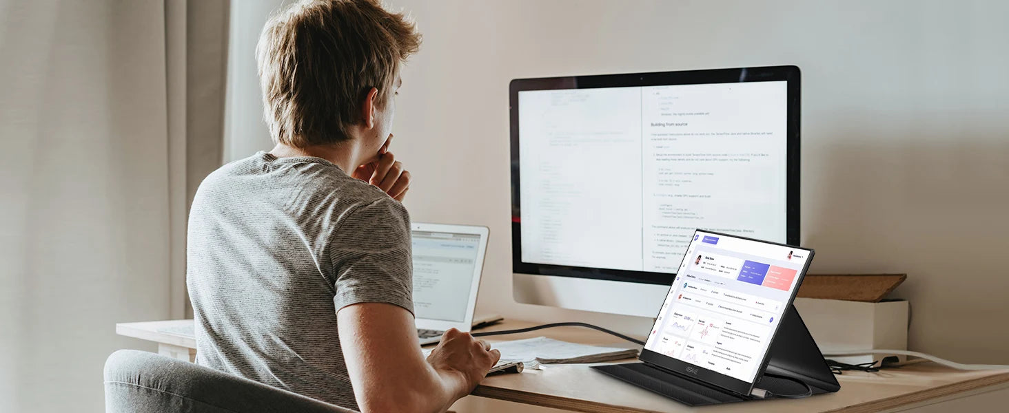 - Portabilidad: pantalla externa portátil con soporte plegable y cubierta protectora para uso en escritorio o viaje