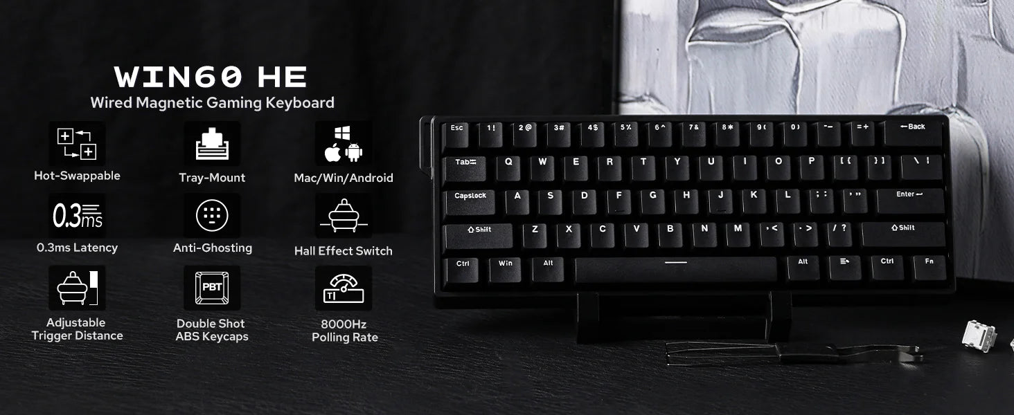WIN60 HE 60% Teclado Magnético Cableado es un teclado mecánico compacto diseñado para escritorios, portátiles y tabletas. Cuenta con 61 teclas en un diseño del 60%, activación ajustable con interruptores Hall Effect para una sensación personalizable, una tasa de sondeo ultrarrápida de 8000Hz y un diseño hot-swap para cambios de interruptores fáciles. Con una conexión USB cableada y retroiluminación monocromática, este teclado ofrece un rendimiento confiable en un paquete elegante y que ahorra espacio.