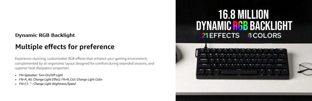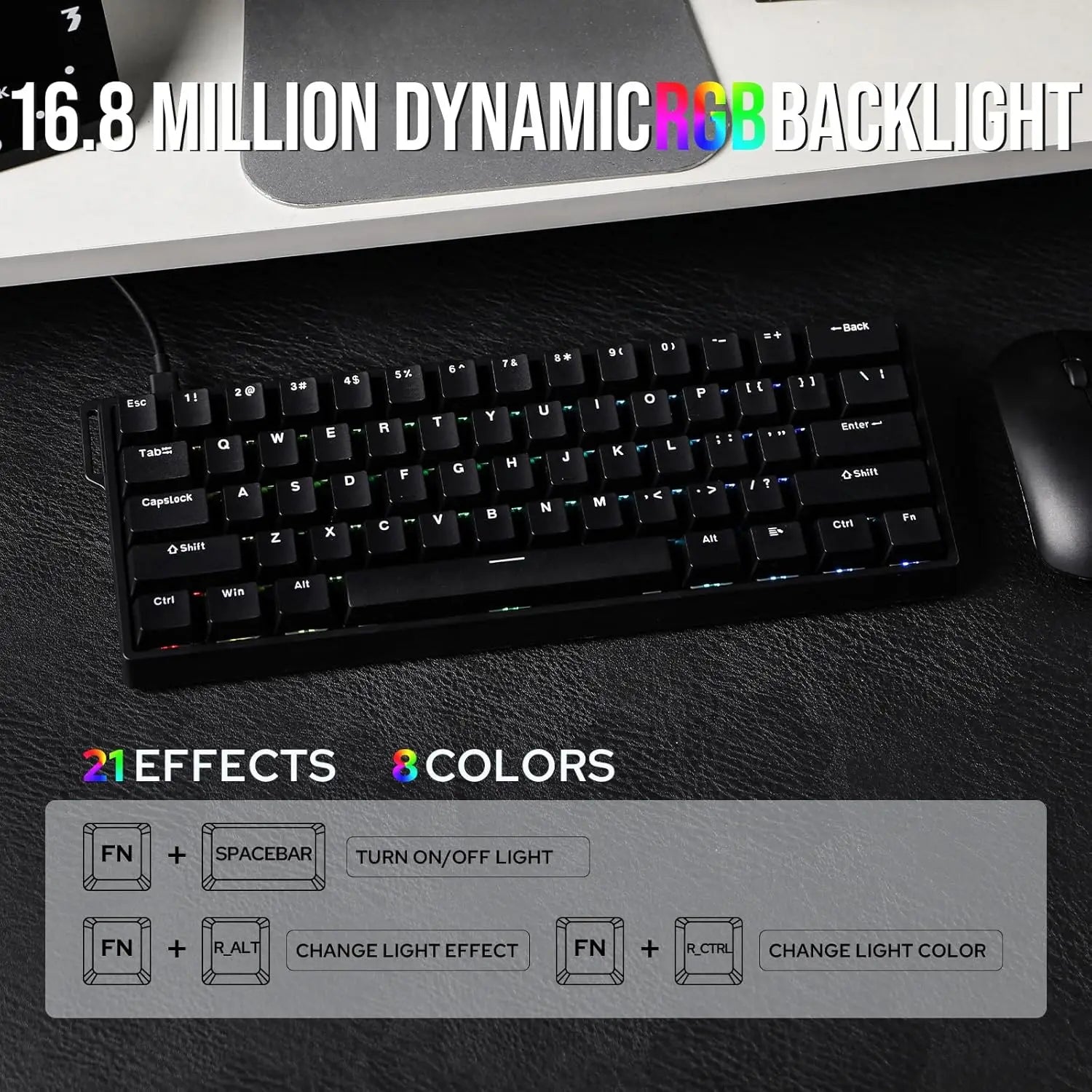 - Diseño compacto de 61 teclas al 60% para una huella mínima en el escritorio