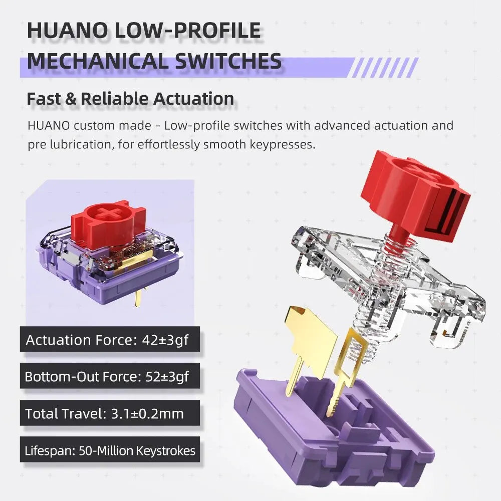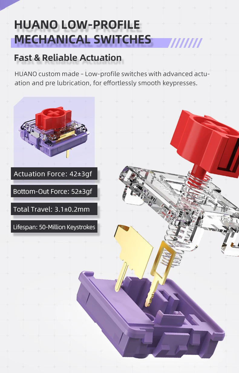 - Diseño mecánico de perfil bajo ofrece una silueta delgada y pulsaciones cómodas para el trabajo diario y juegos por igual.