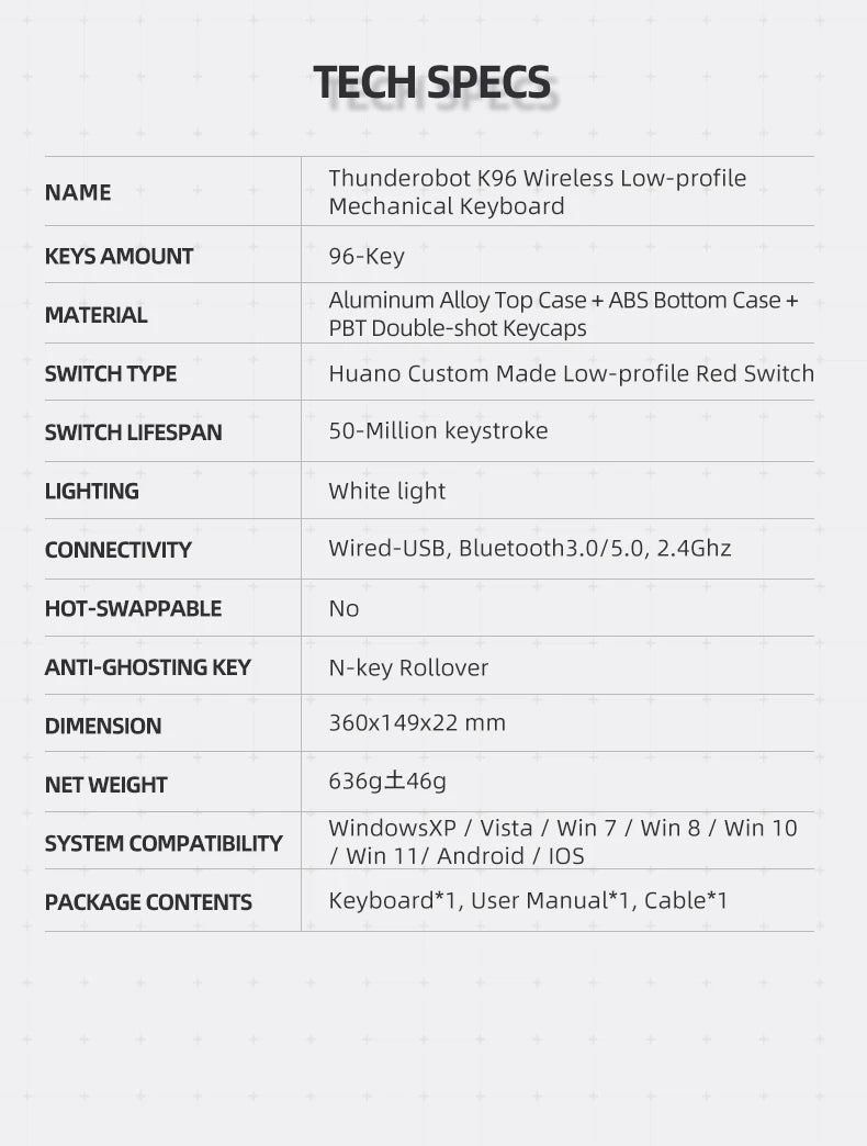 Conozca el teclado mecánico inalámbrico de perfil bajo K96, diseñado para aumentar la productividad en configuraciones de PC, escritorio y portátil. Este compacto teclado de 98 teclas combina un chasis delgado con versatilidad inalámbrica mediante USB y Bluetooth, además de una retroiluminación monocromática y teclas Doubleshot-PBT con leyendas duraderas.