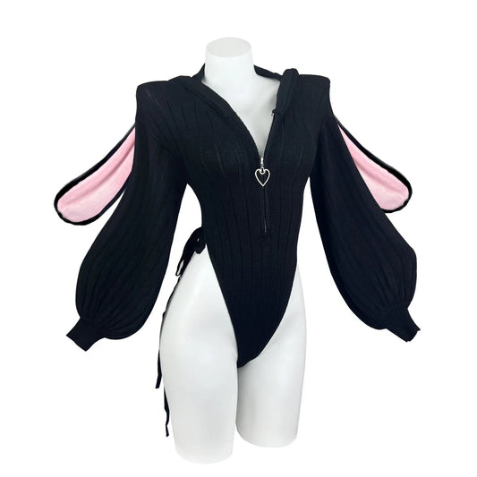 Body en maille doux pour femmes - Capuche avec oreilles de lapin, polyester
