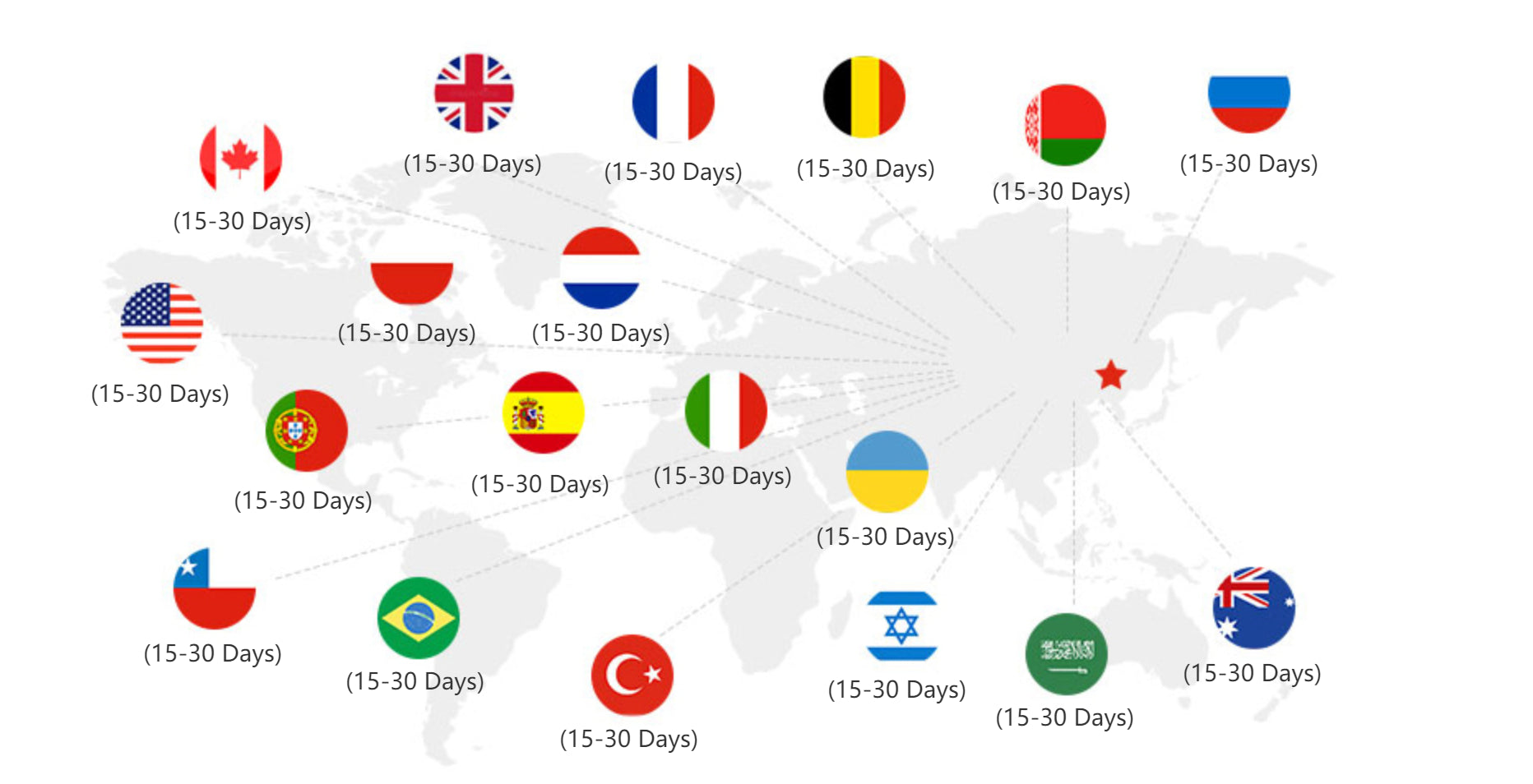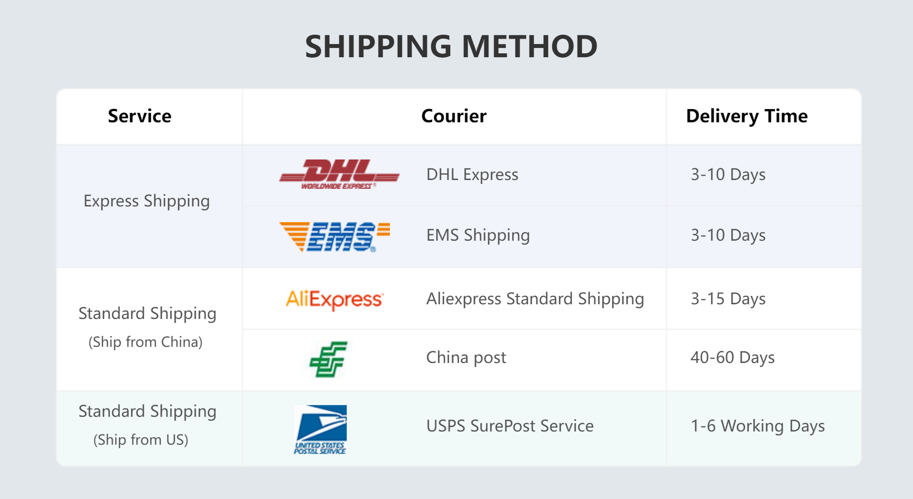 Nous offrons une expédition mondiale vers la plupart des pays. Veuillez prévoir 1 à 2 jours ouvrables pour l'assemblage et le traitement. Après avoir passé une commande, vous pouvez vous attendre à recevoir votre produit sous 5 à 12 jours.