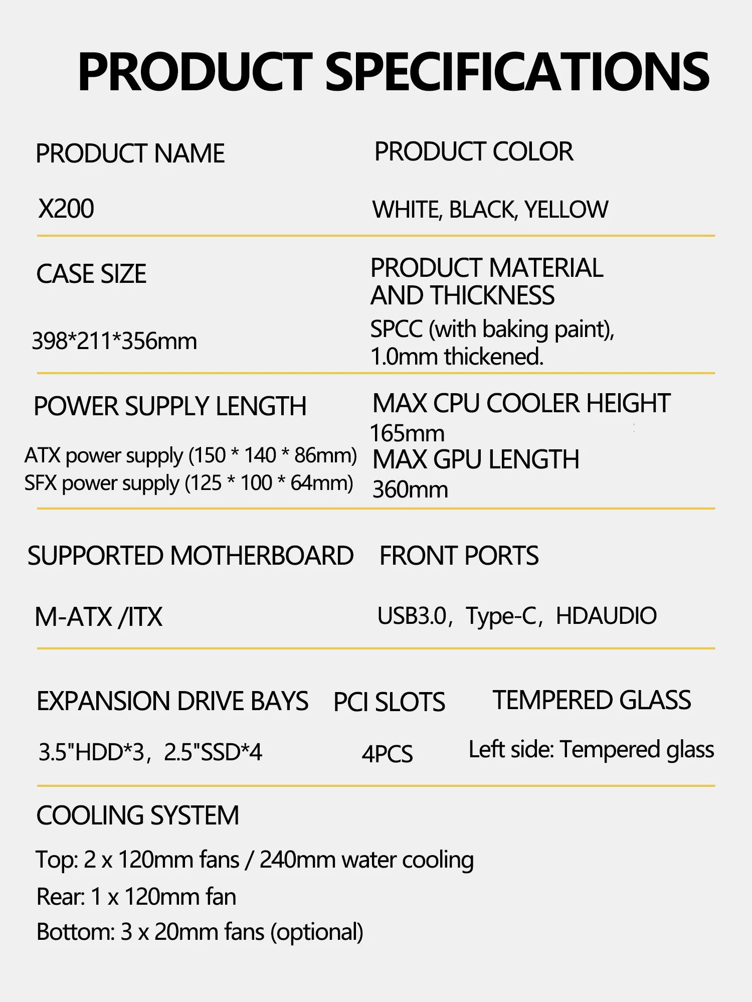 Power Train X200 est un boîtier de bureau compact MINI-ITX/MicroATX conçu pour des configurations à haute efficacité, doté d'un panneau latéral en verre pour une vue claire des composants internes. Il prend en charge un refroidissement liquide de 240 mm et comprend une poignée de transport pour des configurations portables, combinant performance de bureau et facilité de manipulation.