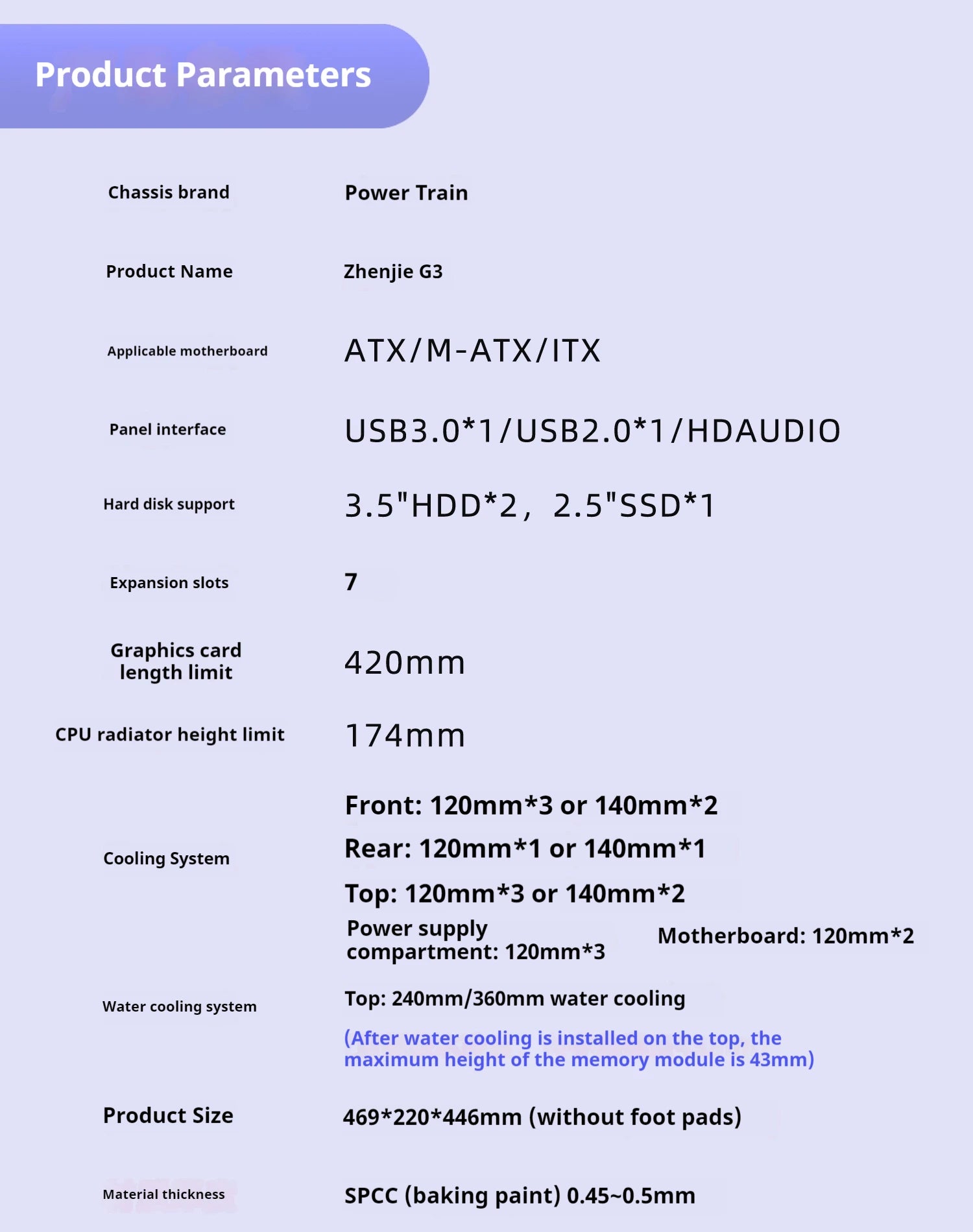 Le boîtier PC G3 est un châssis de bureau avec côté en verre conçu pour supporter les cartes mères ATX, MicroATX et ITX. Il peut accueillir un radiateur jusqu'à 360 mm pour le refroidissement liquide et offre un panneau latéral transparent pour mettre en valeur les composants. Avec une empreinte compacte et une construction solide, il offre un espace flexible pour les disques et les options de refroidissement dans les configurations de bureau.