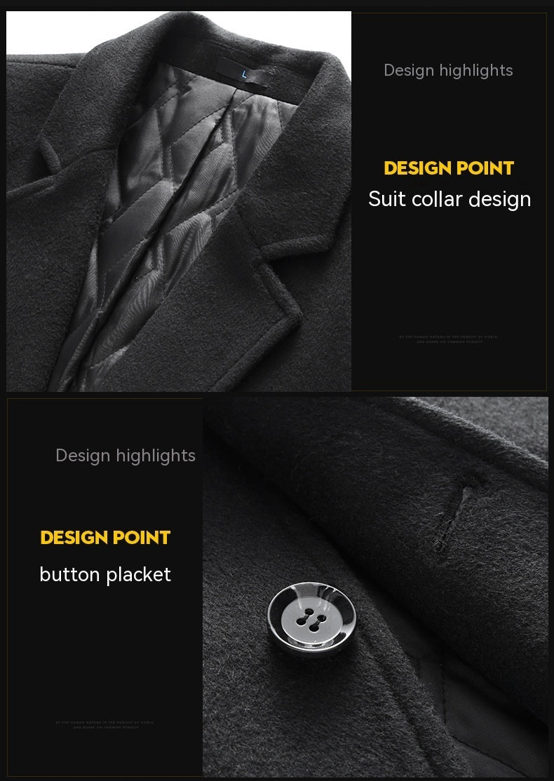 This men's long wool coat combines a tailored slim silhouette with a sharp notched lapel to create a refined, modern look perfect for winter days and evening outings. The knee‑length trench cut and straight hem create a streamlined, elongated profile that layers effortlessly over sweaters or suiting. Thickened woolen fabric with a quilted polyester lining enhances warmth and comfort, while clean embedded‑line pockets and a two‑button front deliver a minimalist, urban aesthetic. Ideal for style‑conscious men seeking a versatile cold‑weather staple, this coat moves seamlessly from the daily commute to weekend dinners.