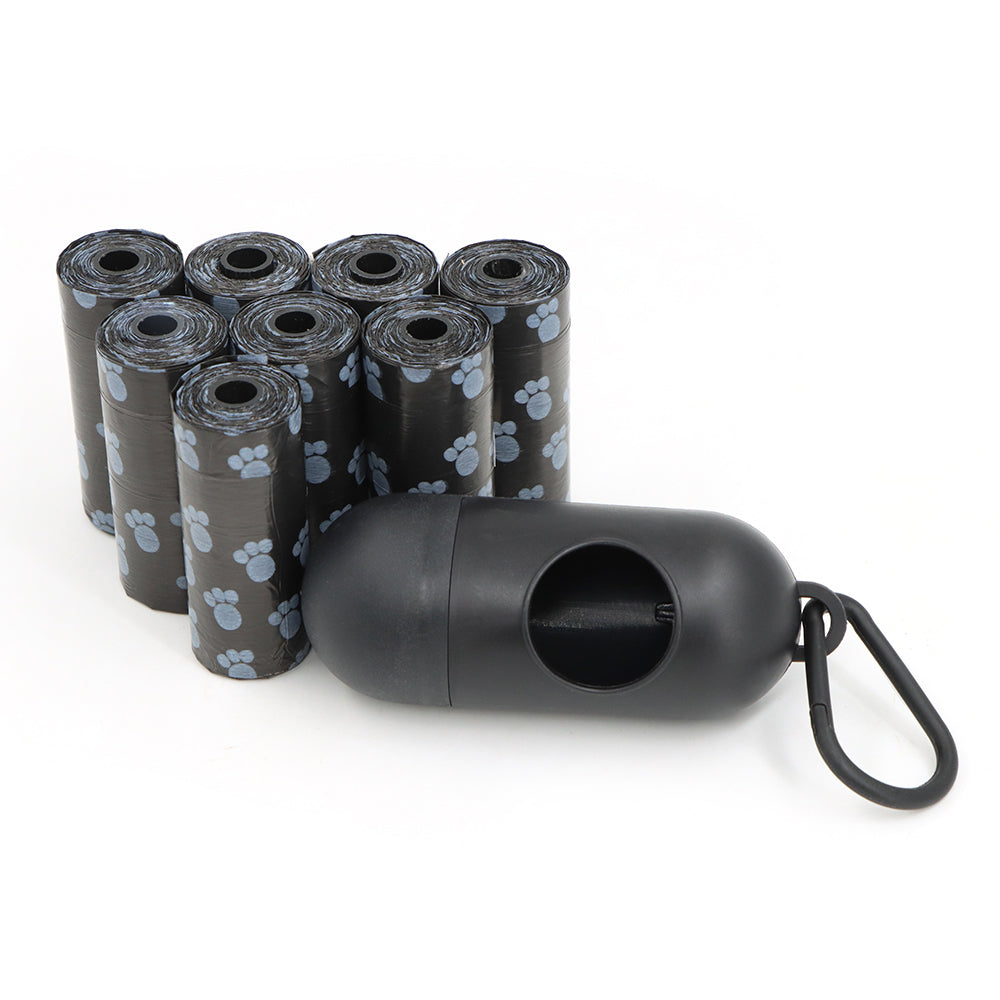 Borse per rifiuti di cane resistenti con un dispenser compatto e pronto per il viaggio offrono una pulizia affidabile e a prova di perdite durante le passeggiate. Questo set include 8 rotoli da 15 borse ciascuno (120 borse totali) con un'apertura a erogazione rapida per l'uso a una mano, più una clip in stile moschettone per attaccare il dispenser a un guinzaglio o a una borsa. Le borse presentano un motivo di impronte di zampa blu su sfondo nero per la visibilità.
