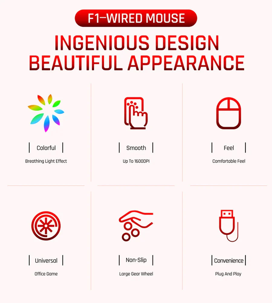 Il F1 Wired 3 Keys Mouse Colorful Lighting è progettato per il gaming e l'uso d'ufficio, offrendo un controllo preciso tramite una connessione USB cablata per prestazioni affidabili su Windows e iOS. Presenta una disposizione a 3 pulsanti con una rotellina e un'illuminazione vivace per illuminare qualsiasi scrivania. Alimentato via USB, offre una reattività immediata per lavoro o gioco.
