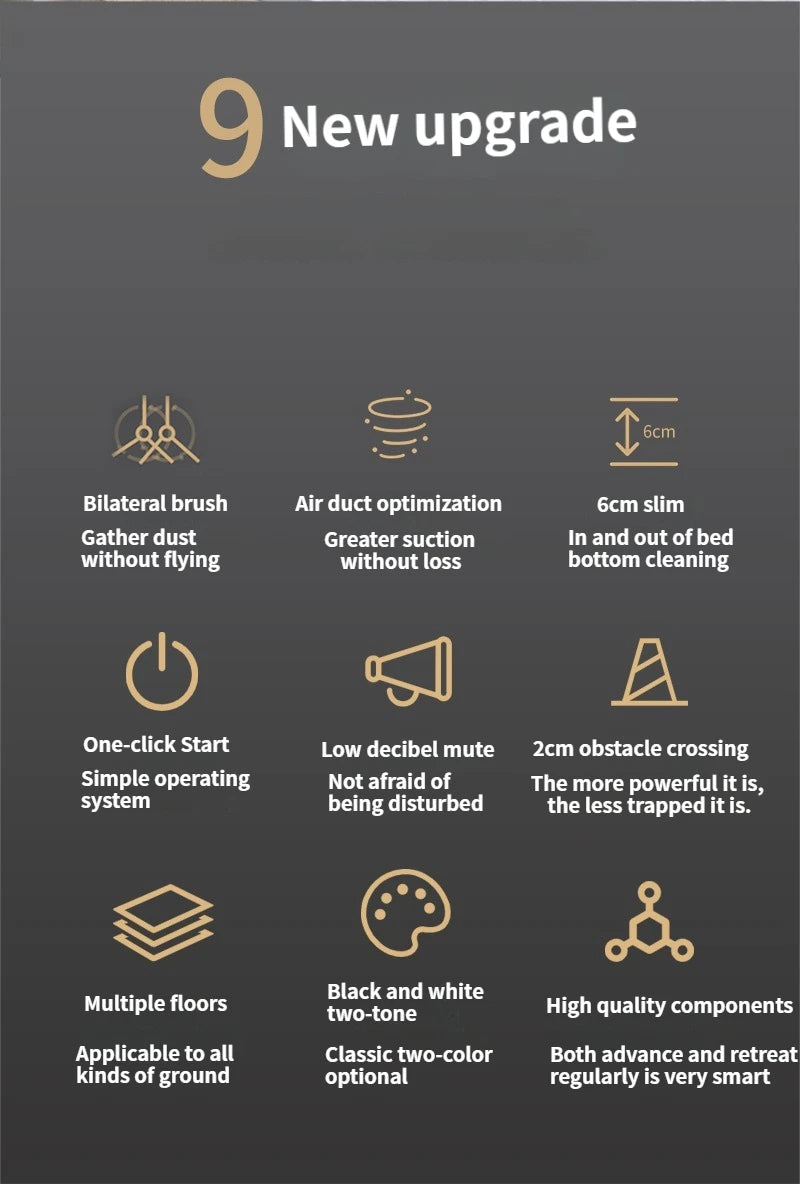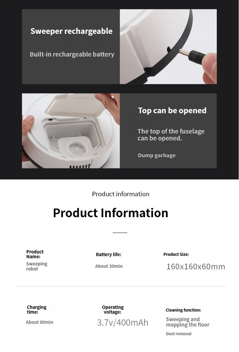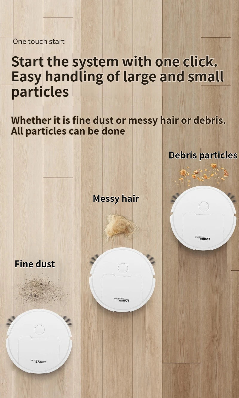 Compatto ed efficiente, il Robot Spazzante a Aspirazione 3 in 1 Mini Spazzatrice Automatica è un piccolo pulitore robotico rotondo progettato per le attività di raccolta quotidiana. Il suo profilo compatto e il peso di 250g lo rendono un'opzione salvaspazio per la pulizia di routine delle superfici, con caratteristiche visibili per la scalata a basso gradino e la navigazione ai bordi.