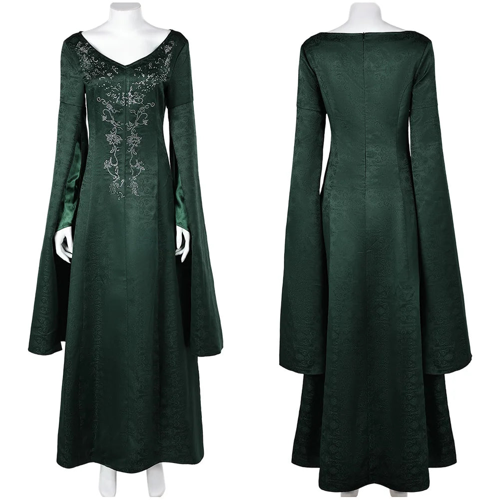 Alicent Cosplay-kjole middelalderfantasi kjole Halloween — en gulvlengde middelalderstil kjole designet for Alicent-inspirert cosplay og fantasyarrangementer. Denne jacquard bomullskjolen har lange flytende ermer, broderte detaljer og tidsriktig kanting for å skape en autentisk middelaldersilhuett som passer til Halloween-kostymer og LARP.