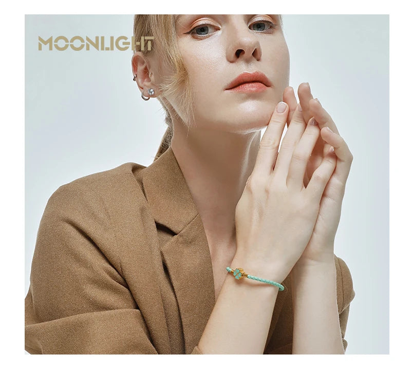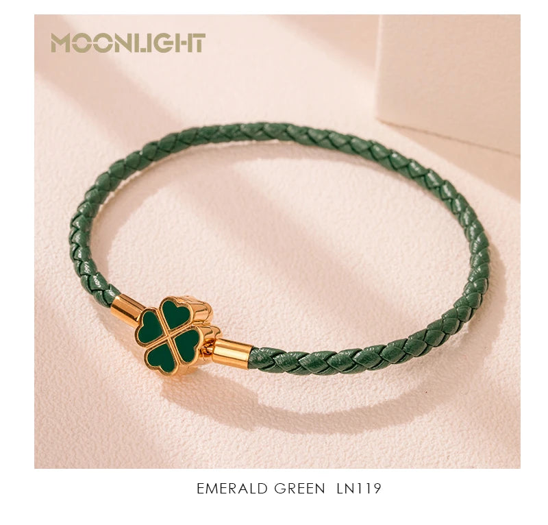 - Design: Flettet grønt lærbånd med et gullfarget firkløver-anheng aksentert med grønn emalje.
