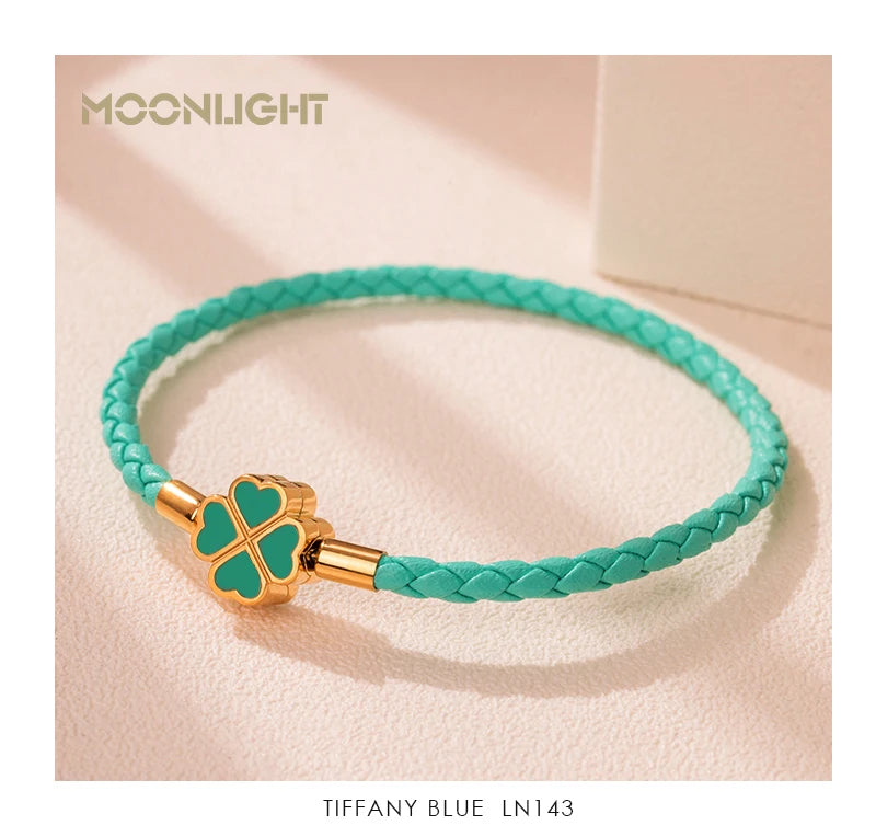 Uttrykk lykke og stil med det grønne firkløver-lucky armbåndet for kvinner. Dette flettede lærarmbåndet viser en gullfarget firkløver-anheng med grønn emalje, som gir et stilig preg for hverdagsbruk eller festlige anledninger. Et allsidig motetilbehør designet for å komplettere ethvert utseende.