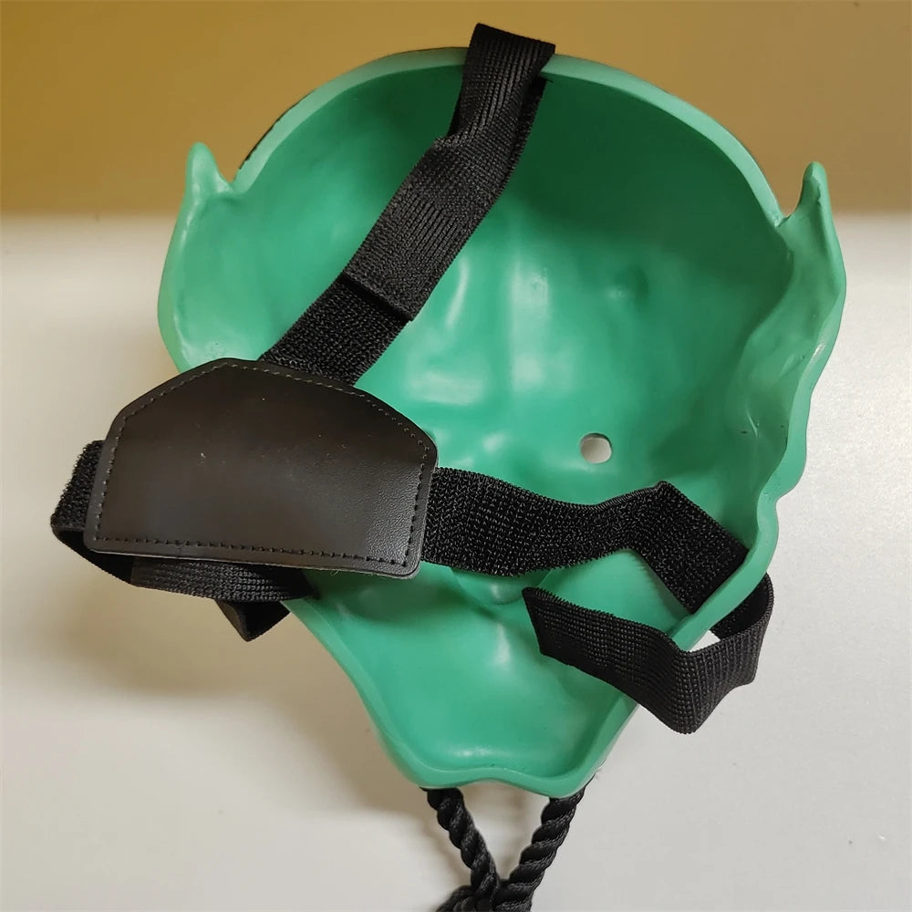 Horror Hannya Mask Resin Demon Cosplay Halloween 2025 bringer tradisjonell Hannya demon-forestilling til kostyme og cosplay med et skulpturert harpiksdesign som fremhever skarpe tenner, spisse horn og et fryktinngytende uttrykk. Maskens blanke overflate, gullfargede horn- og tannaksenter, og flettet tau-tie skaper et slående fokuspunkt for Halloween, teaterforestillinger eller cosplay-arrangementer.