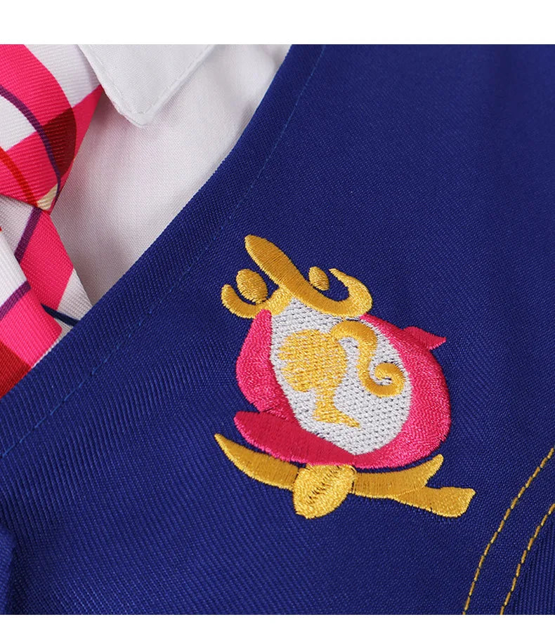 - Design detaljer: Marineblå vest med knapper i gulltone, hvite pufferm, rutete plissert skjørt og matchende slips for autentisk skoleuniformstil.