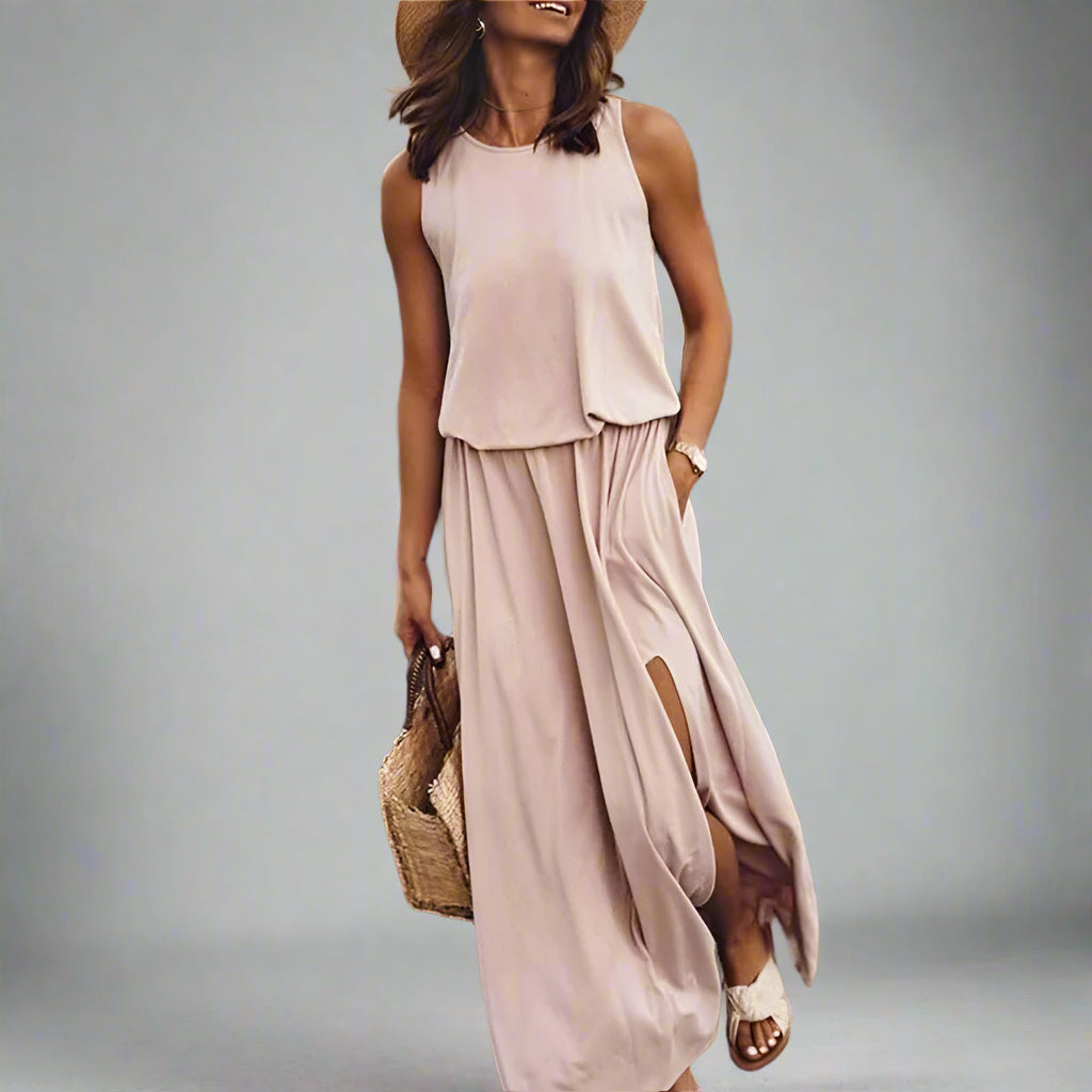 Vår/Sommer Kvinne Trendy Retro Uten Ermer Kjole, Ensfarget To-Delt Sett