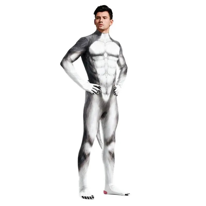 Husky-kostyme heldrakt unisex par Halloween-fest — en heldekkende heldrakt med trykk av huskypels og muskeldesign for temabaserte arrangementer og Halloween-kostymer. Den unisex strikkede heldrakten har en avtakbar hale og praktiske glidelåser for enkel påkledning, noe som gjør den til et allsidig valg for par-kostymer og cosplay.