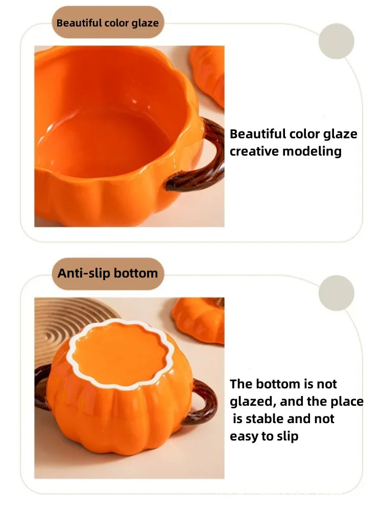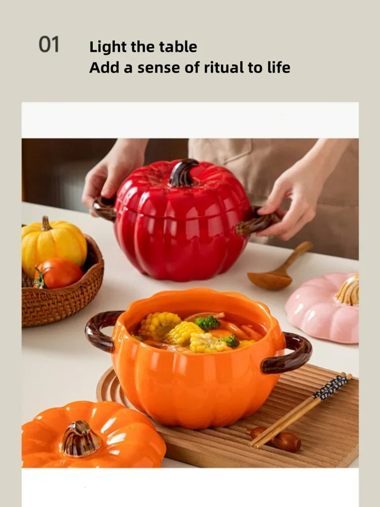 Keramische Soepketel met Deksel met een creatief pompoenontwerp, deze binaurale soepkom is ideaal voor huishoudens die houden van royale porties soep of noedels. Gemaakt van porseleinen keramiek en magnetronbestendig, combineert het praktisch nut met een speelse uitstraling. Het meegeleverde deksel helpt de warmte vast te houden, terwijl de dubbele zijgrepen het serveren gemakkelijk maken.