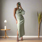 This elegant midi dress features a unique asymmetrical shoulder design and long sleeves, making it a stylish choice for various occasions. Perfect for work, social events, or a night out, it combines comfort with a modern aesthetic.Key Features