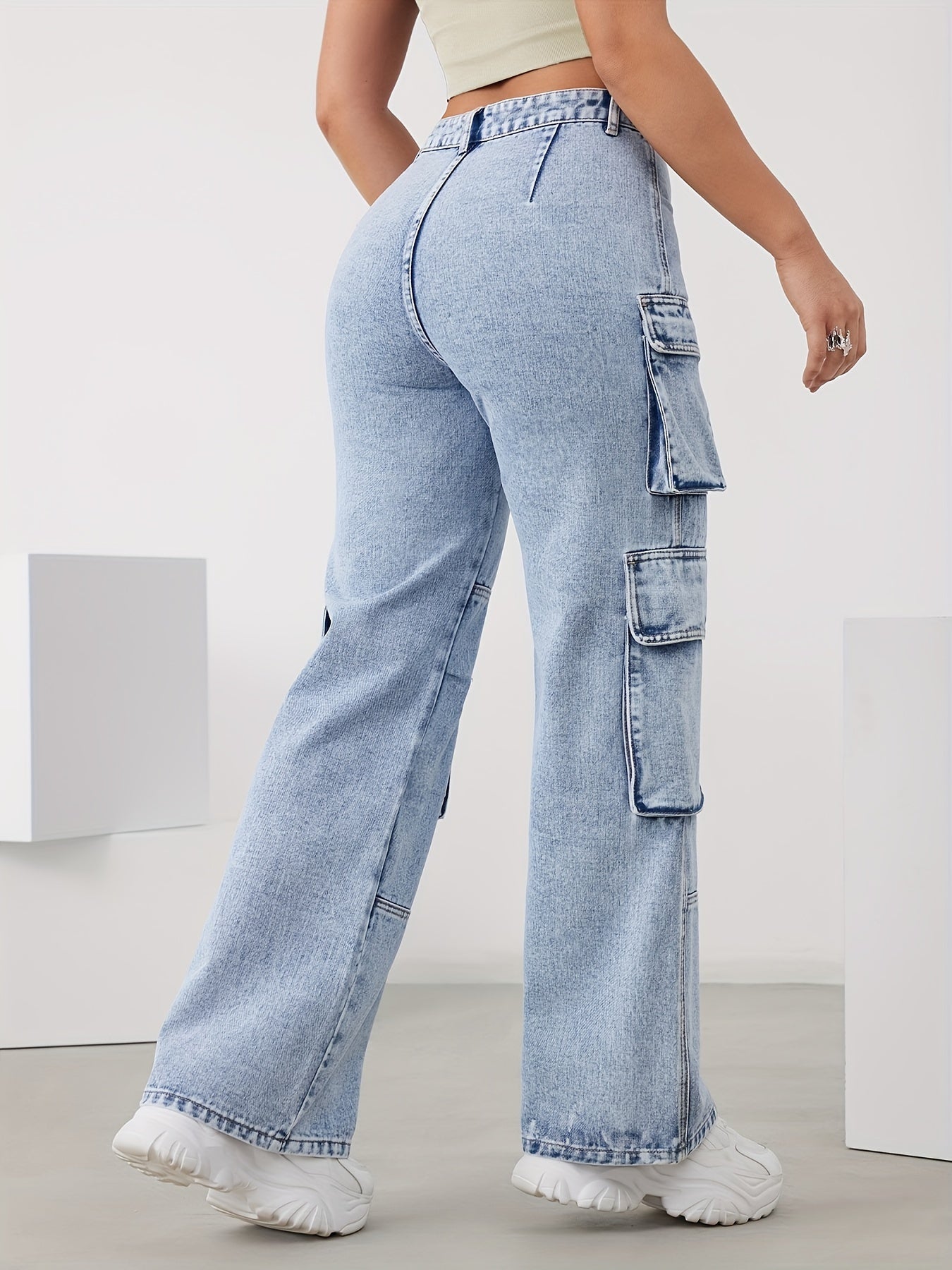 High-Waist Cargo Trousers for Women in Medium Blue, Stretch Fabric, Straight-Leg Fit, Stylish Snowflake Design