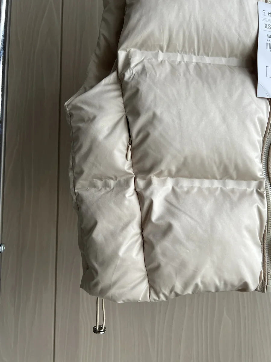This sleeveless short cardigan combines a quilted puffer silhouette with a high stand-up collar to create a modern, sporty-chic look perfect for autumn and winter layering. The thick, padded construction and front zipper closure enhance both warmth and ease, while the clean, minimal lines give it a contemporary, versatile vibe. Ideal for streetwear lovers and those seeking practical style, this piece transitions effortlessly from weekend errands to layered city outfits.