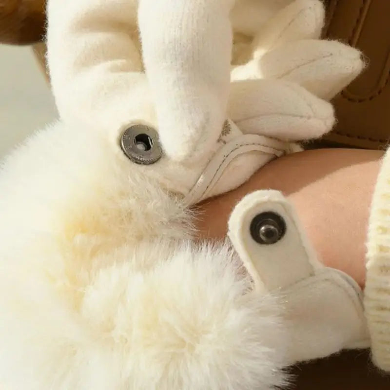 • Features: Touchscreen-compatible fingertips, embroidered faux rabbit-fur cuff, snap closure