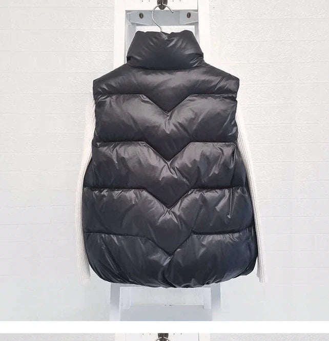 This sleeveless vest combines a roomy, Korean-inspired loose silhouette with a high stand collar and horizontal baffle quilting to create a modern, cozy look perfect for autumn and winter layering. The glossy polyester shell and polyester filling provide lightweight warmth while the zip-front and zip pockets add casual functionality. Ideal for leisure time outdoors or city commutes, the minimalist design reads both sporty and fashion-forward. Versatile enough to style over knits or under coats, it strikes a balance between comfort and street-ready polish.