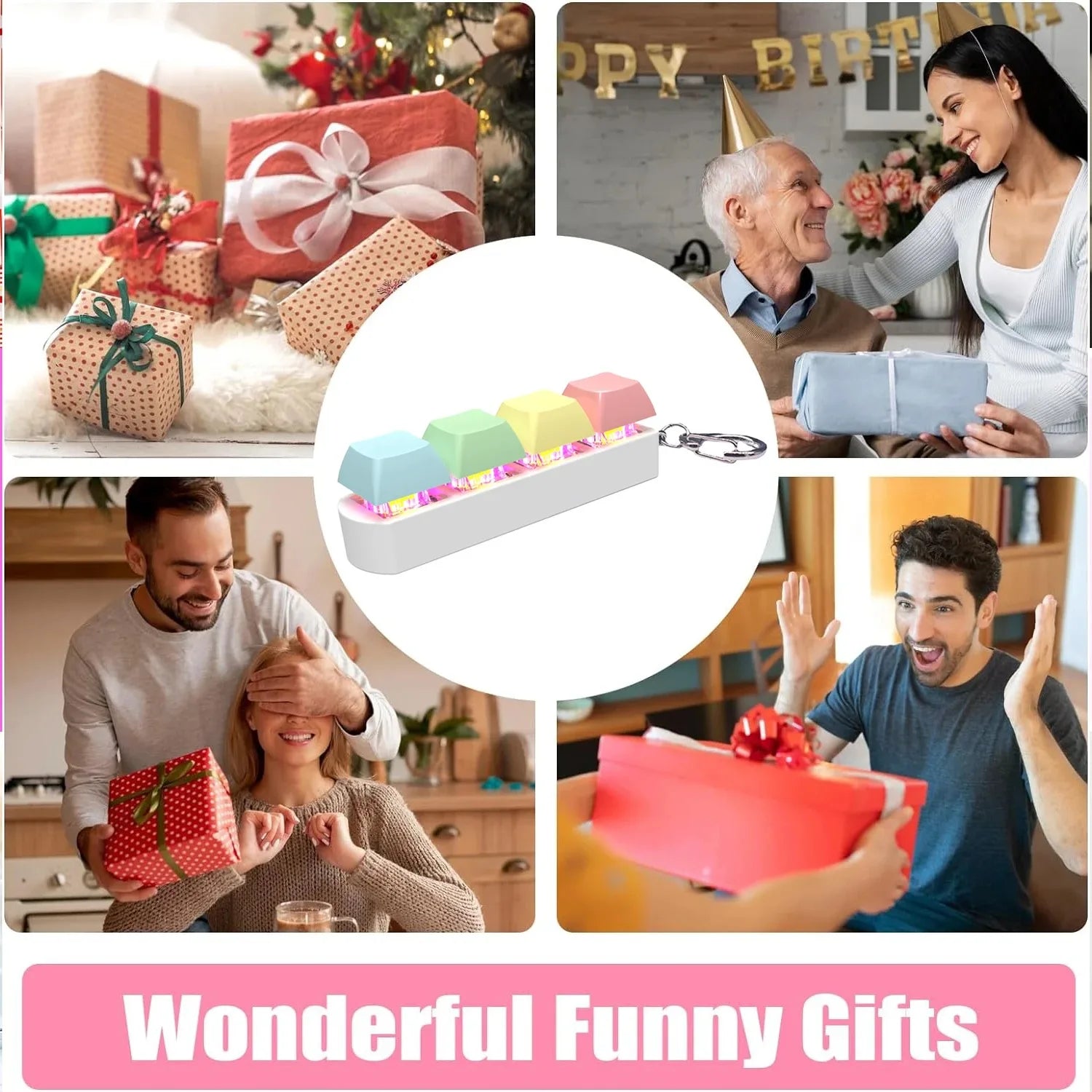 Compact and portable, this 4-in-1 keyboard fidget toy offers four tactile keys for stress relief. Each key is illuminated by colorful LEDs for a soothing, visual backdrop, and a built-in keychain keeps it handy wherever you go.