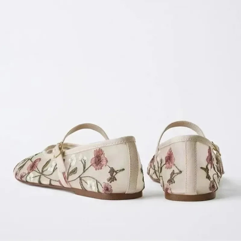 This mesh embroidered ballet flat combines a classic Mary Jane silhouette with delicate floral embroidery to create a romantic, fashion-forward look perfect for spring and summer occasions. The sheer mesh upper and slim buckle strap enhance breathability and comfort, while the rounded toe and low-profile sole keep the aesthetic effortlessly feminine. Ideal for garden parties, casual weddings, or everyday city styling, this shoe reads minimalist-romantic with a modern, wearable twist. Designed for women seeking refined comfort, it transitions smoothly from daytime errands to evening gatherings.