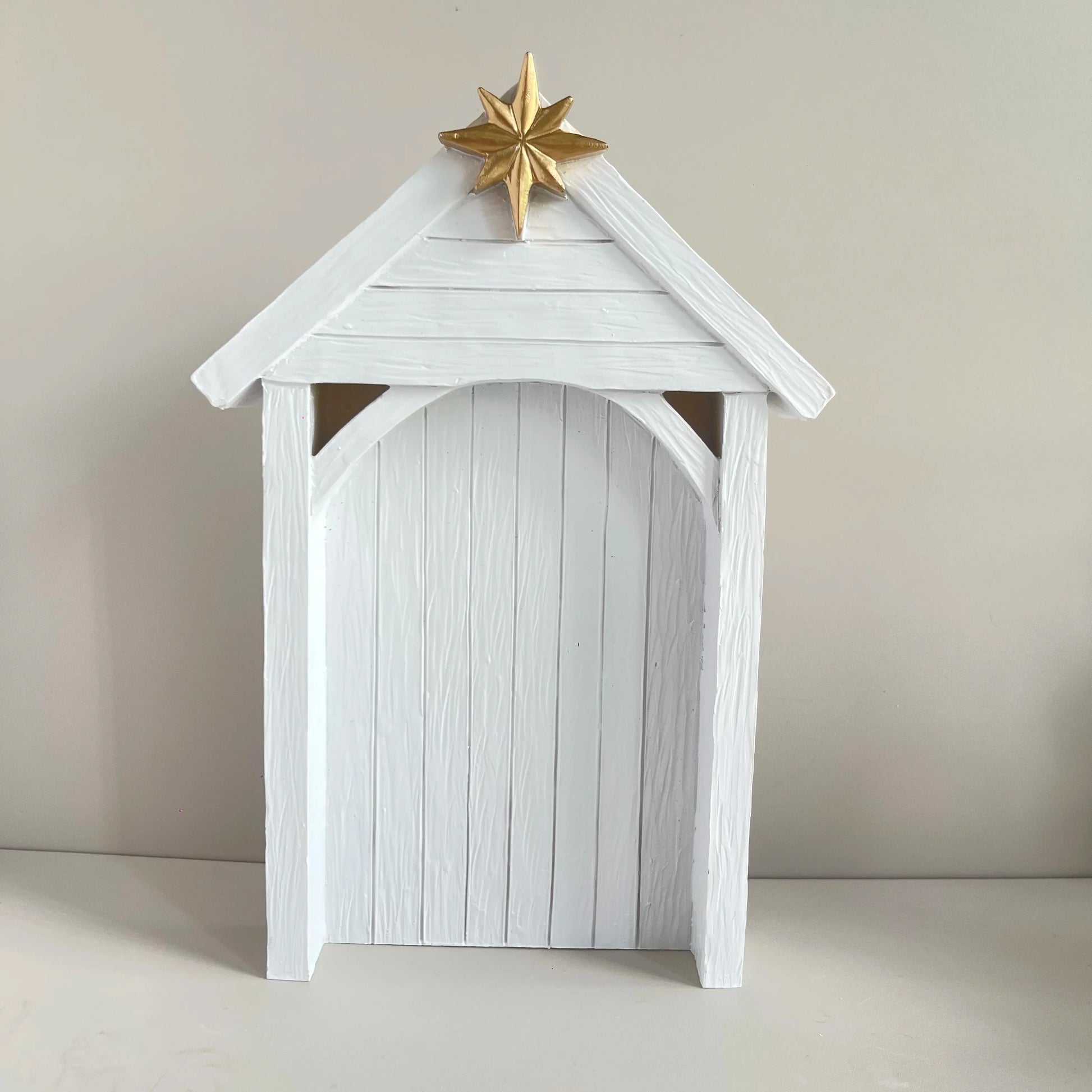 - White-washed stable backdrop with a gold star topper adds classic Christmas charm.