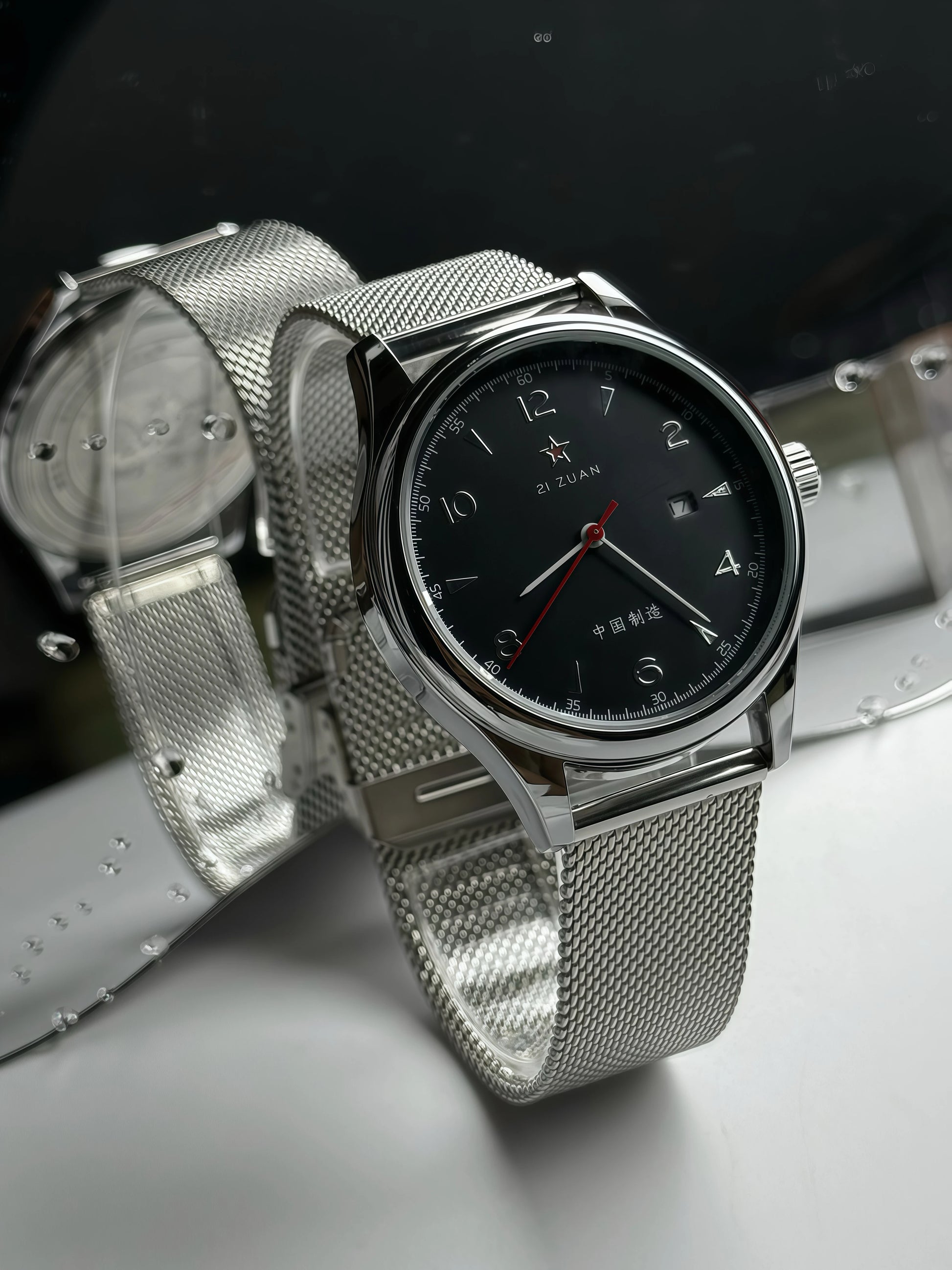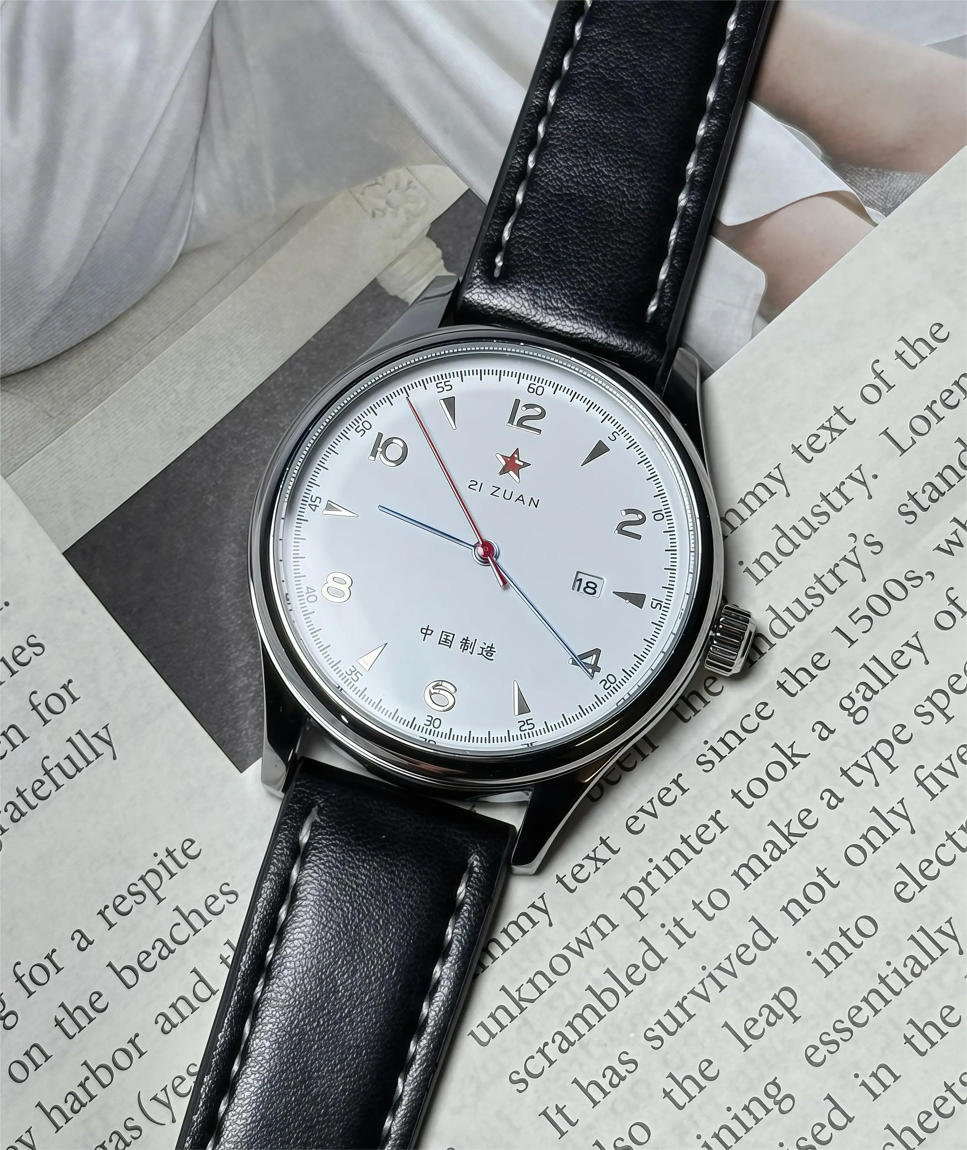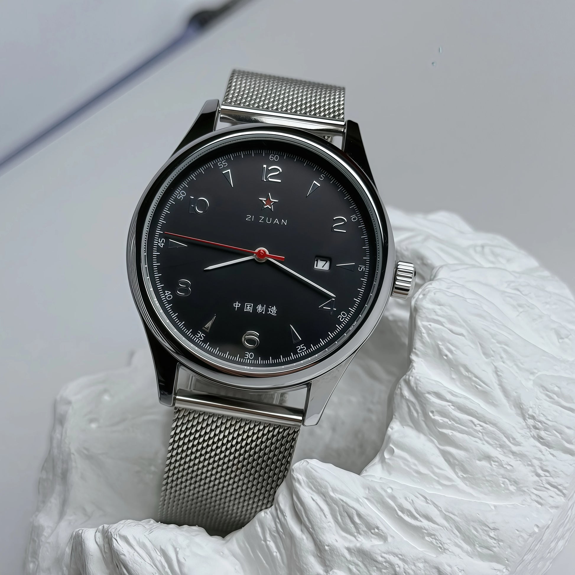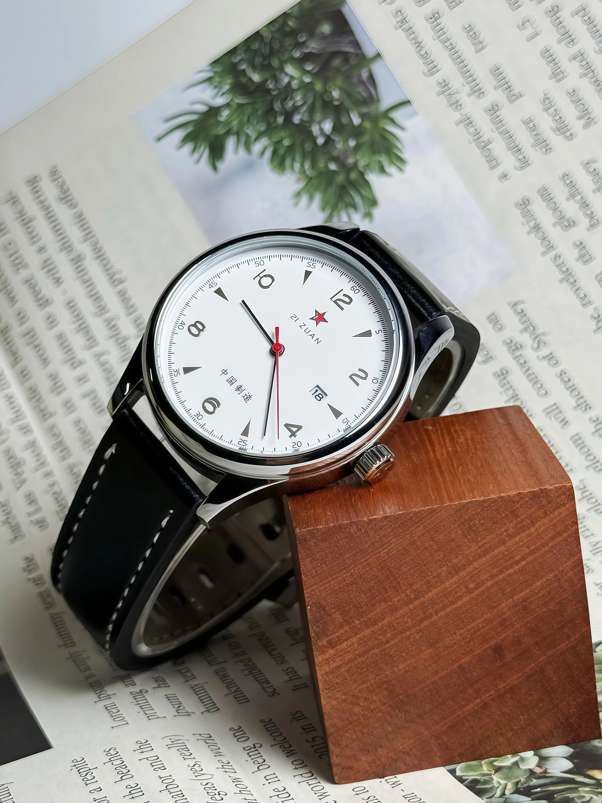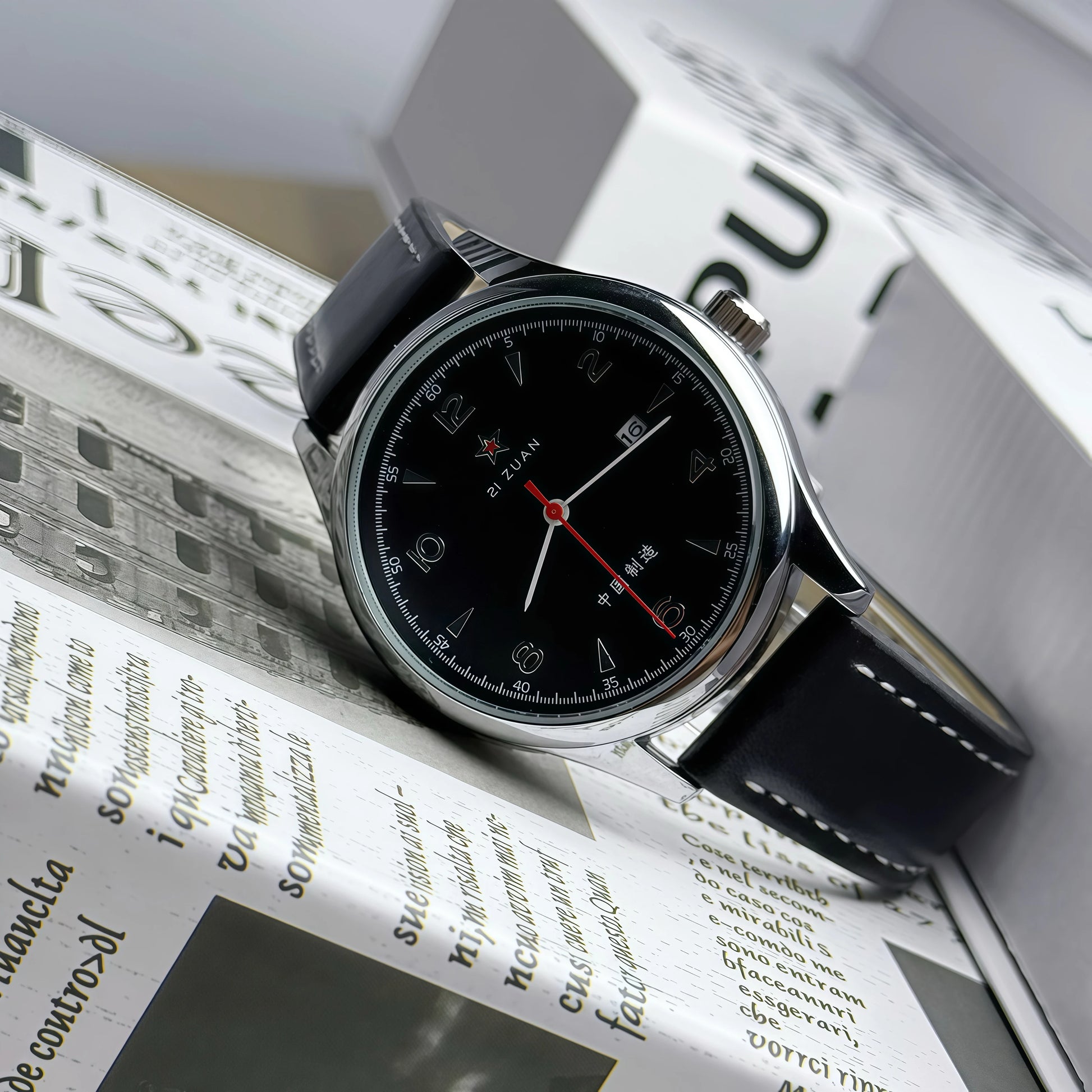 - Analog dial with gold-tone numerals and a red seconds hand