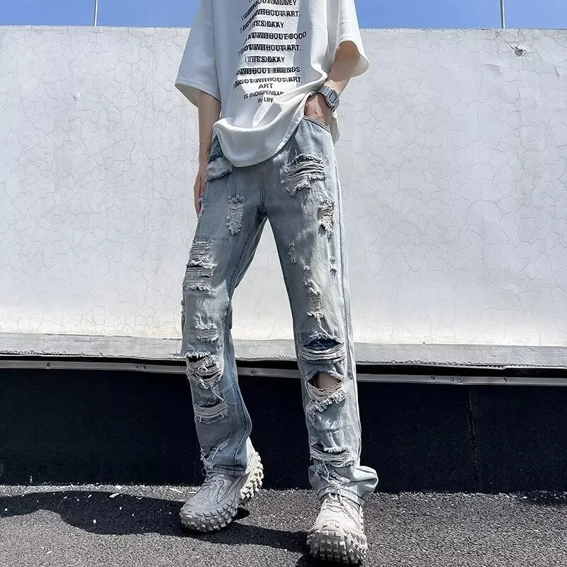 This pair of ripped baggy jeans combines an oversized straight-leg silhouette with heavy distressed detailing to create a vintage Y2K streetwear look perfect for casual, everyday wear across the four seasons. The midweight cotton denim offers a slightly soft, worn-in feel that enhances comfort and drape, while the strategic rips and washed finish add an edgy, high-street attitude. Ideal for fans of American hip hop and retro-inspired fashion, these pantalones deliver an effortless, fashion-forward vibe from day to night.