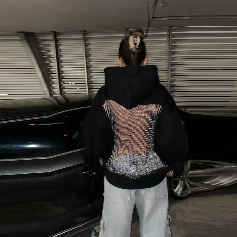 This pullover hoodie combines a relaxed, boxy silhouette with a statement hollow-out mesh back to create a bold, fashion-forward look perfect for street parties and transitional autumn evenings. The soft blended fabric and roomy cut enhance comfort and easy layering, while the taped hood and raw-edge spliced detailing add a modern, Y2K-inspired twist. Ideal for trendsetters and lovers of high-street style, this piece moves effortlessly from daytime cool to night-out glam.