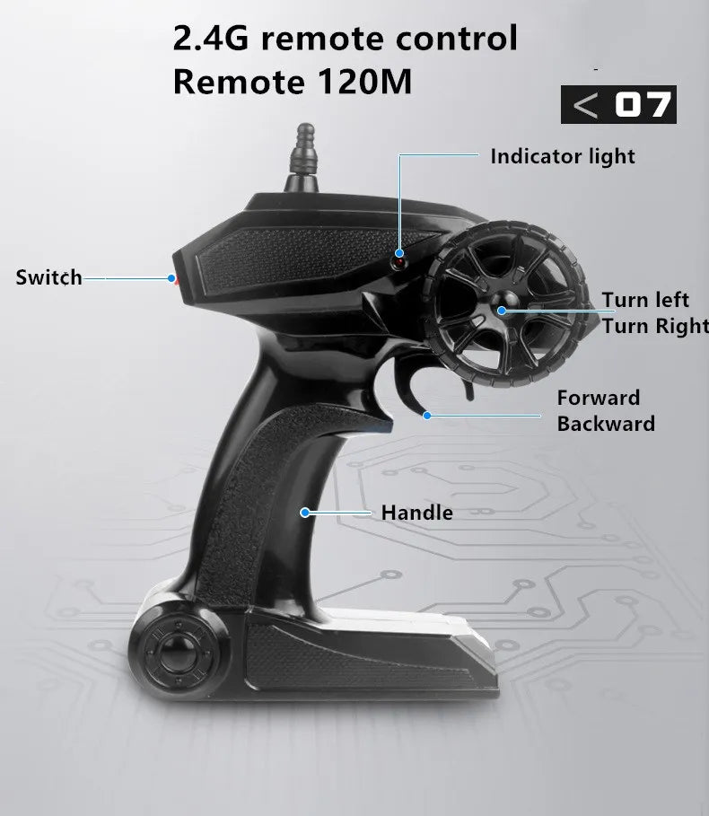 - 2.4GHz remote control with MODE2 operation for precise handling; remote range about 120 meters.