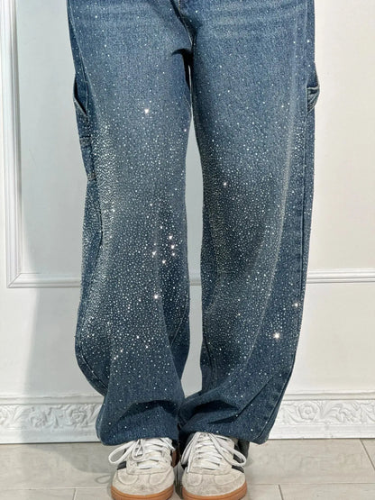 Relaxed Fit Blue Denim Straight Leg Jeans with Rhinestone Embellishments for Casual Glamour