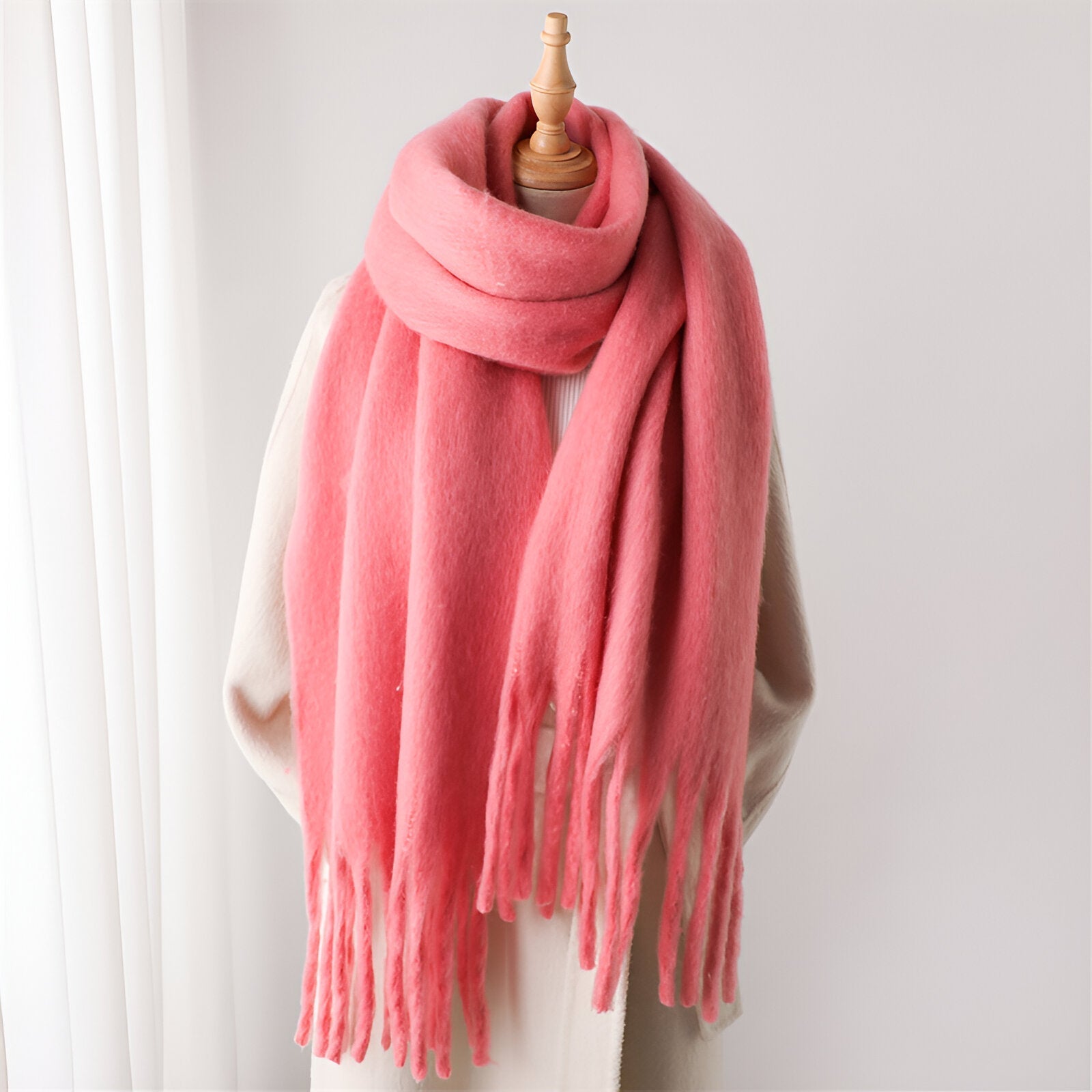 This scarf combines a plush, cashmere-like texture with generous length and delicate fringed ends to create a luxurious look perfect for cold-weather days and chic winter evenings. The soft, oversized drape enhances both comfort and style, while the fine twisted fringe adds a modern, tactile finish. Ideal for those who love elevated basics and effortless elegance, this piece moves seamlessly from daytime errands to cozy nights out.
